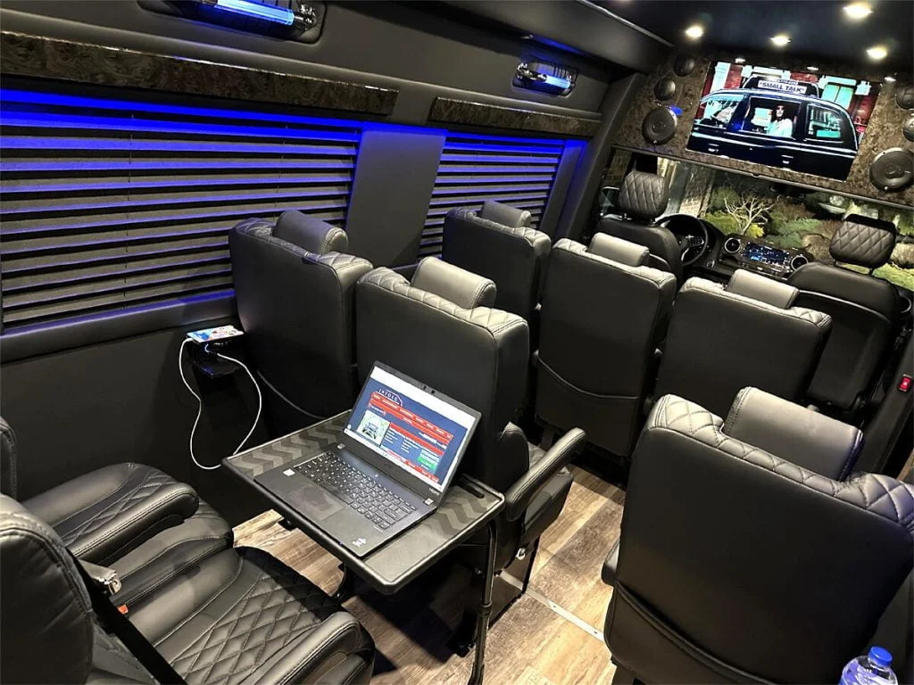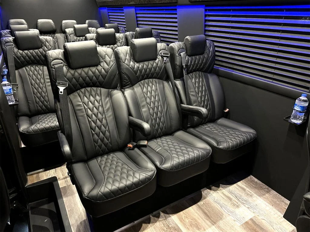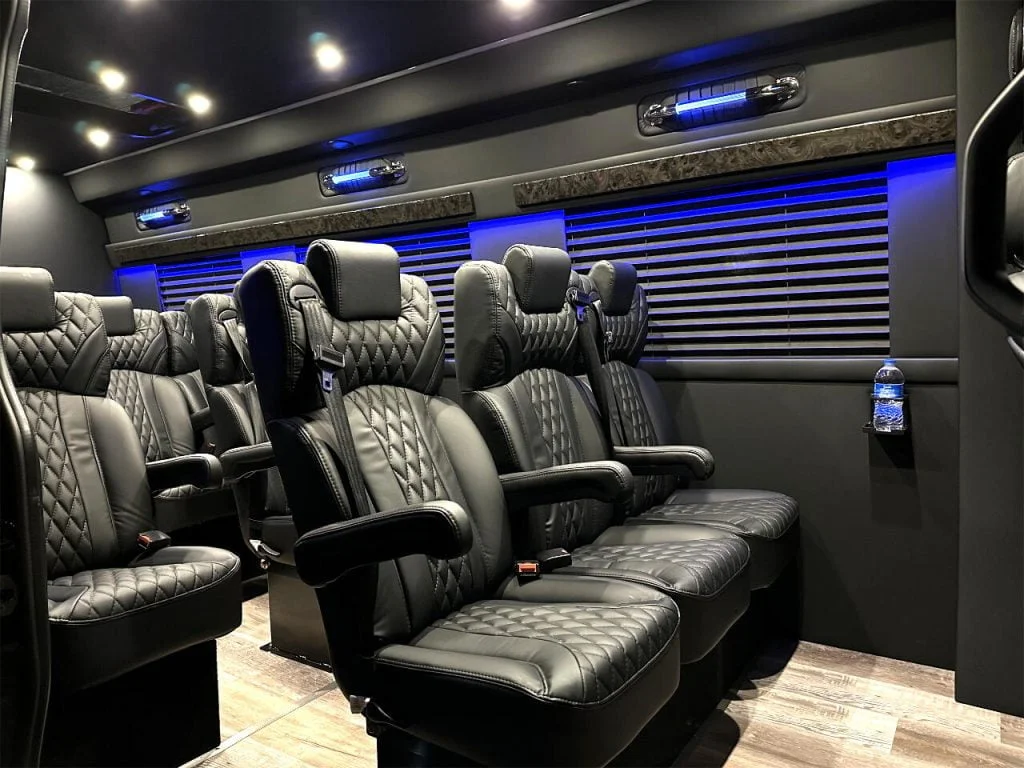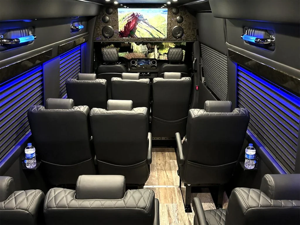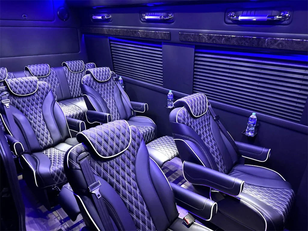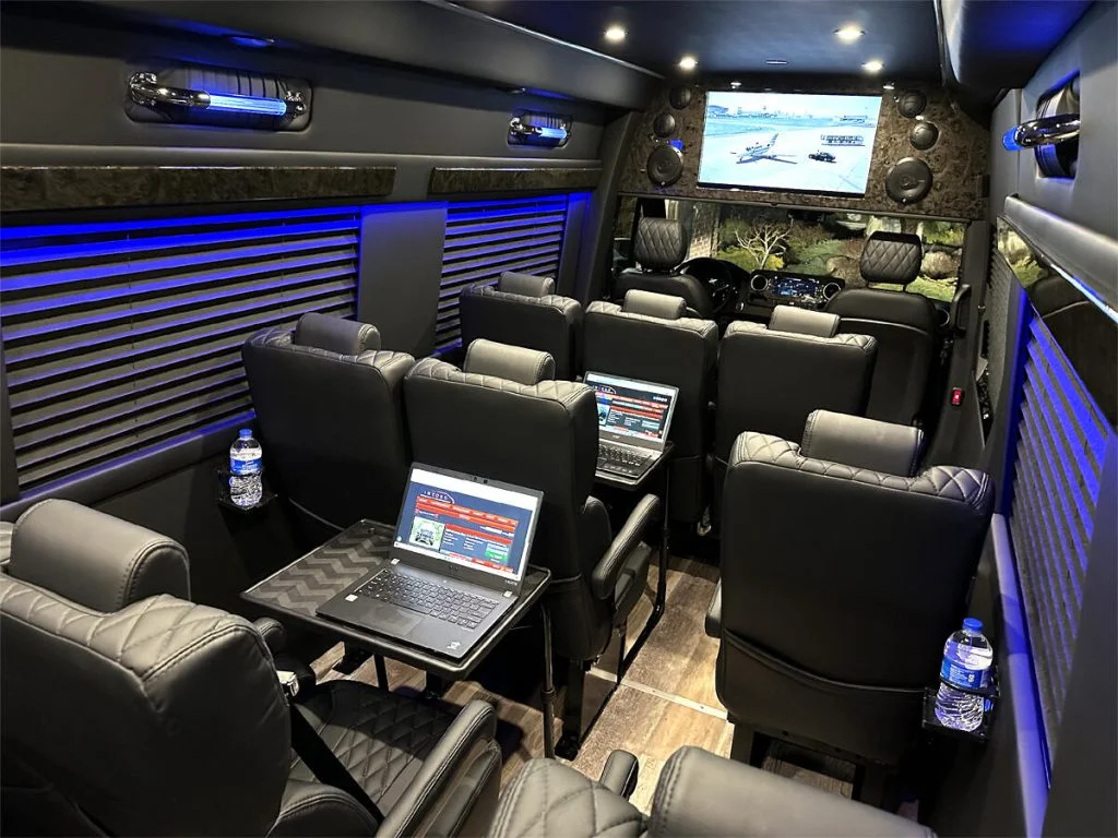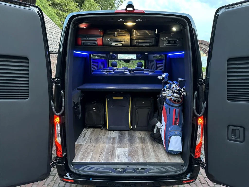 Auto Elite’s Minibus is designed for executive transportation over long distances. This 15 passenger shuttle features large legroom, reclinable diamond stitch shuttle seats, fold down cupholders, USB charge ports, fold out laptop tables, and a three story trunk with golf straps and overhead storage accessible from the interior of the custom sprinter van.