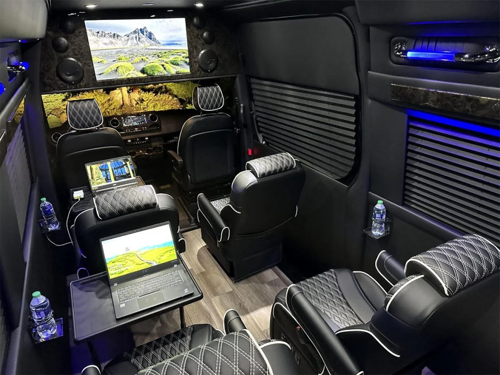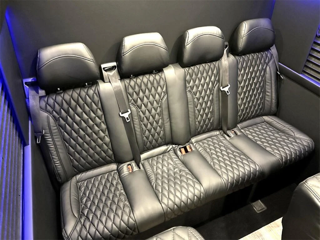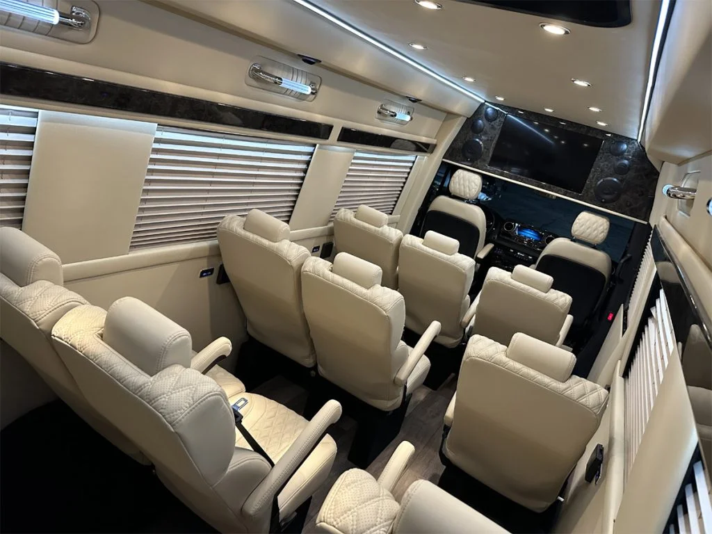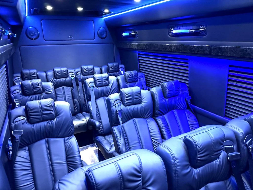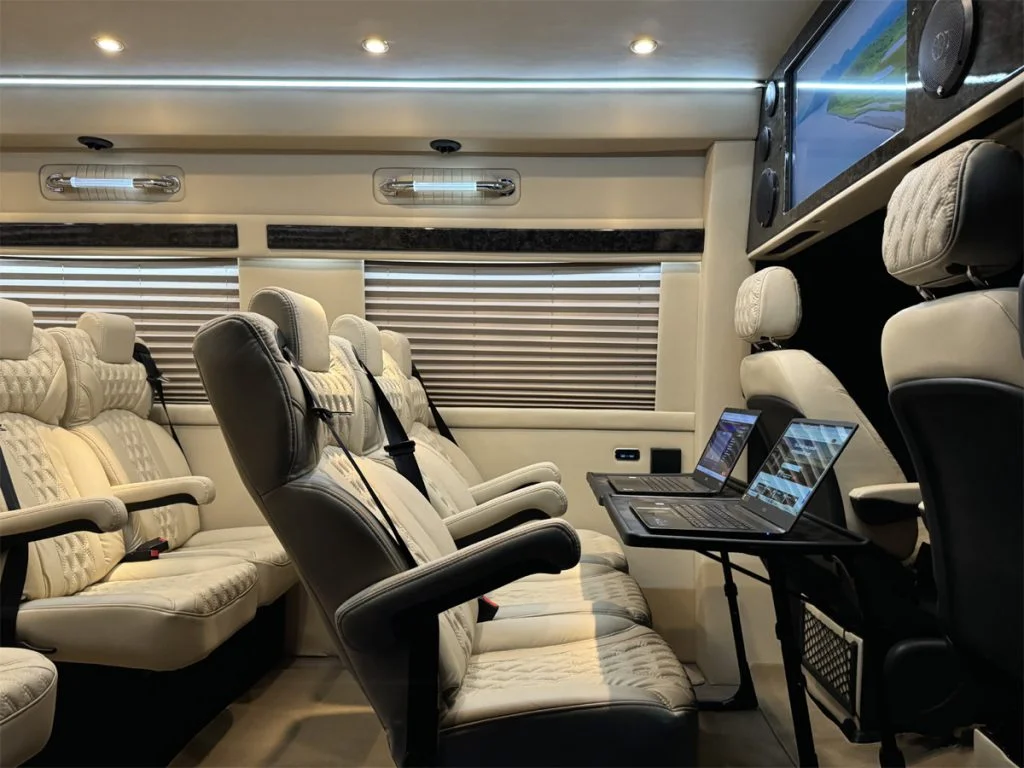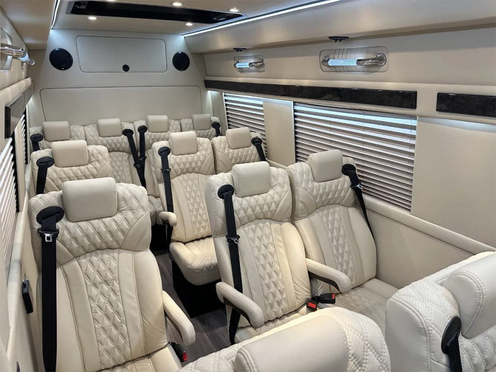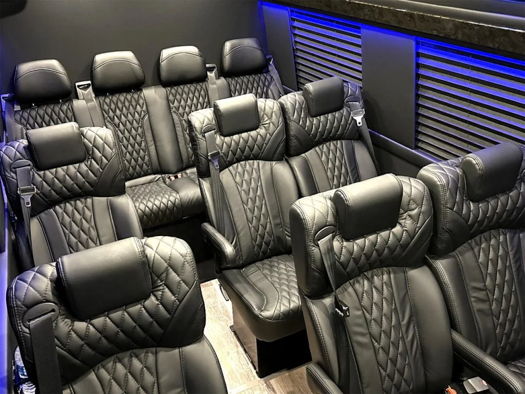 Auto Elite’s Minibus is designed for executive transportation over long distances. This 15 passenger shuttle features large legroom, reclinable diamond stitch shuttle seats, fold down cupholders, USB charge ports, fold out laptop tables, and a three story trunk with golf straps and overhead storage accessible from the interior of the custom sprinter van.