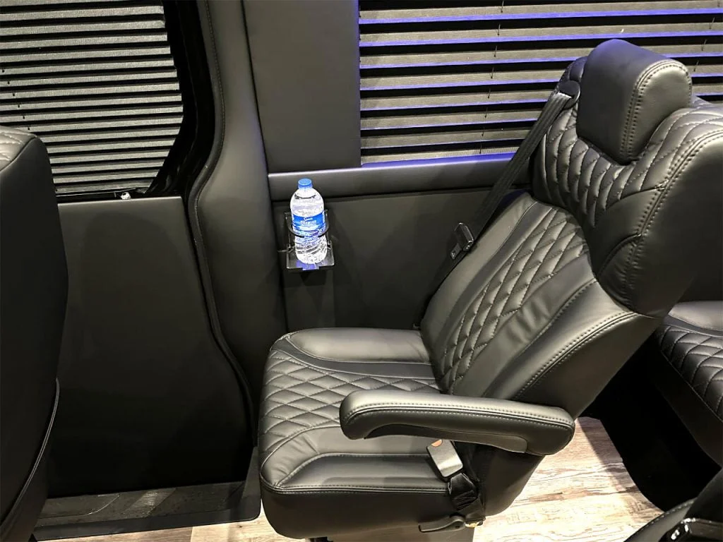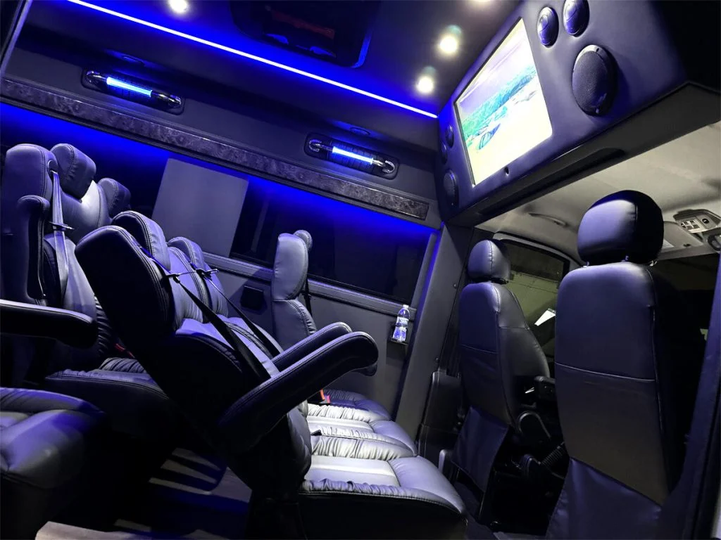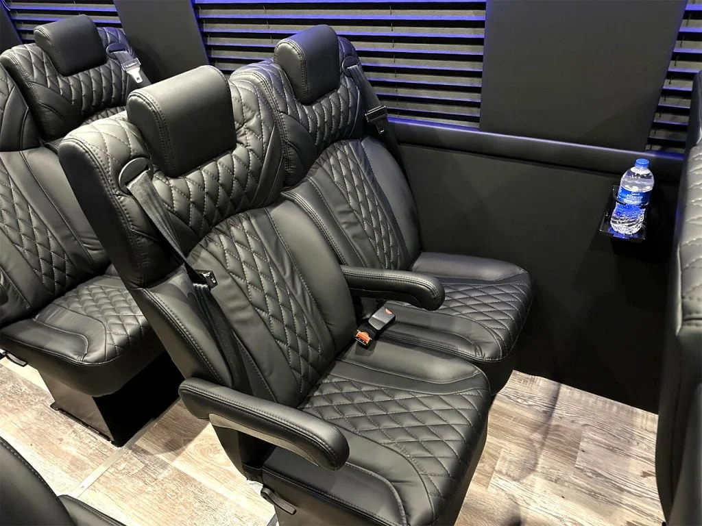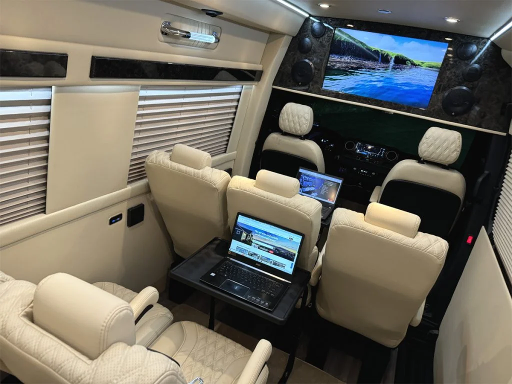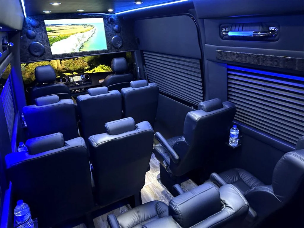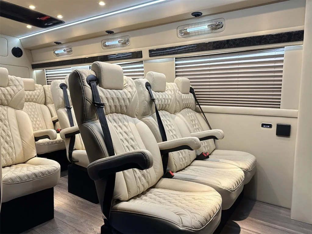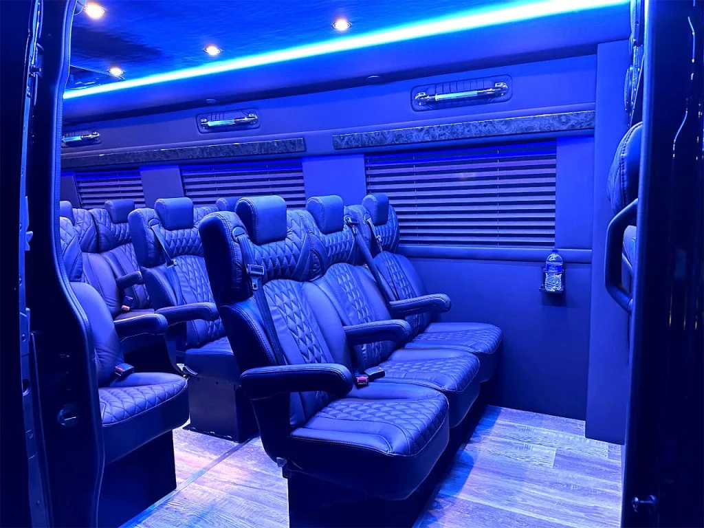 Auto Elite’s Minibus is designed for executive transportation over long distances. This 15 passenger shuttle features large legroom, reclinable diamond stitch shuttle seats, fold down cupholders, USB charge ports, fold out laptop tables, and a three story trunk with golf straps and overhead storage accessible from the interior of the custom sprinter van.