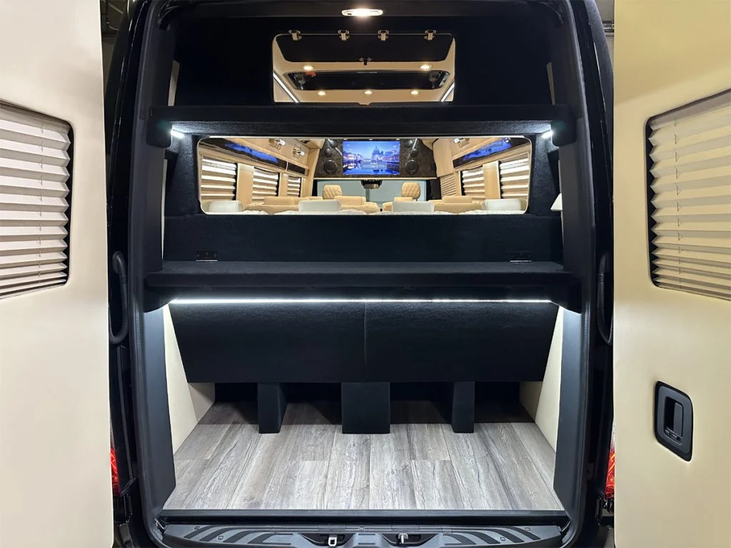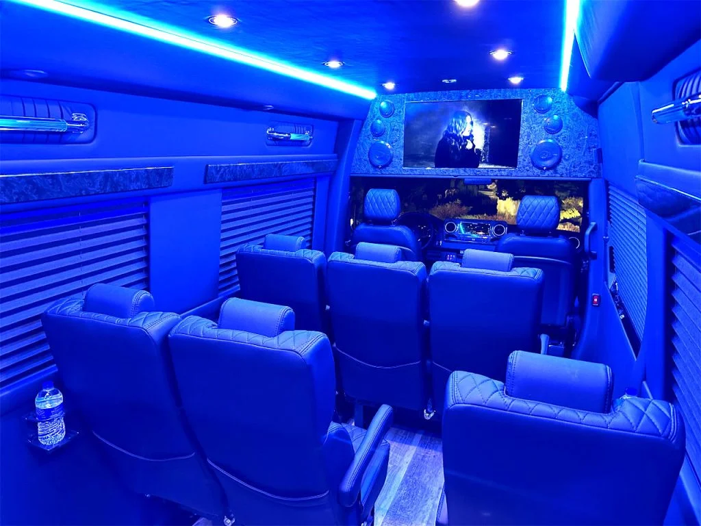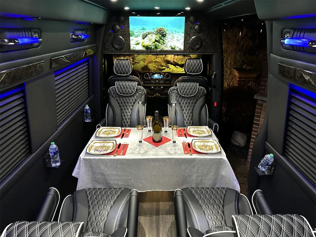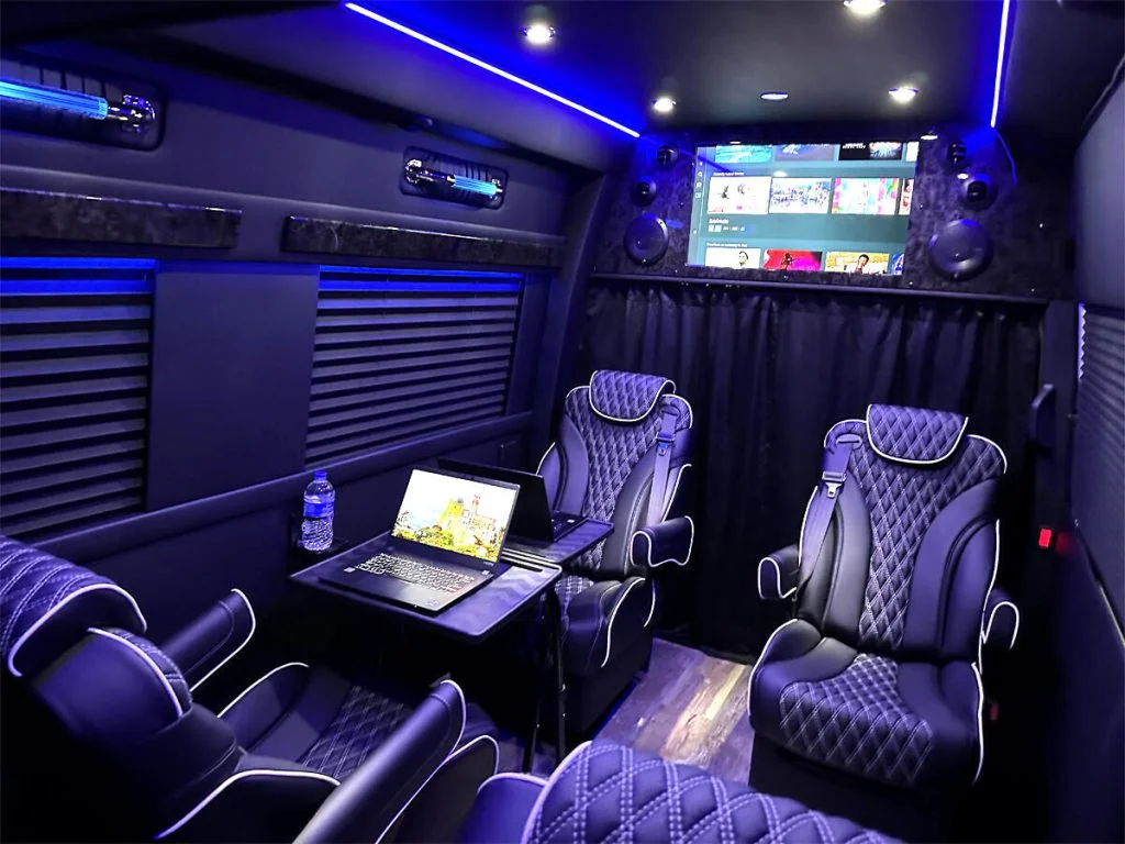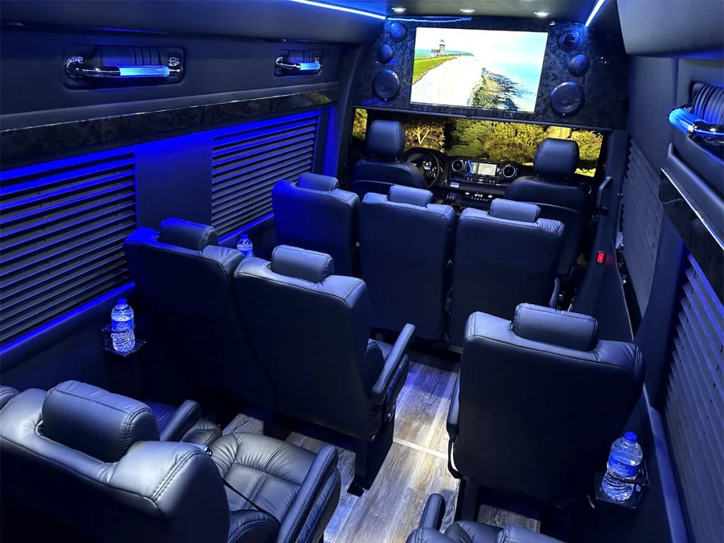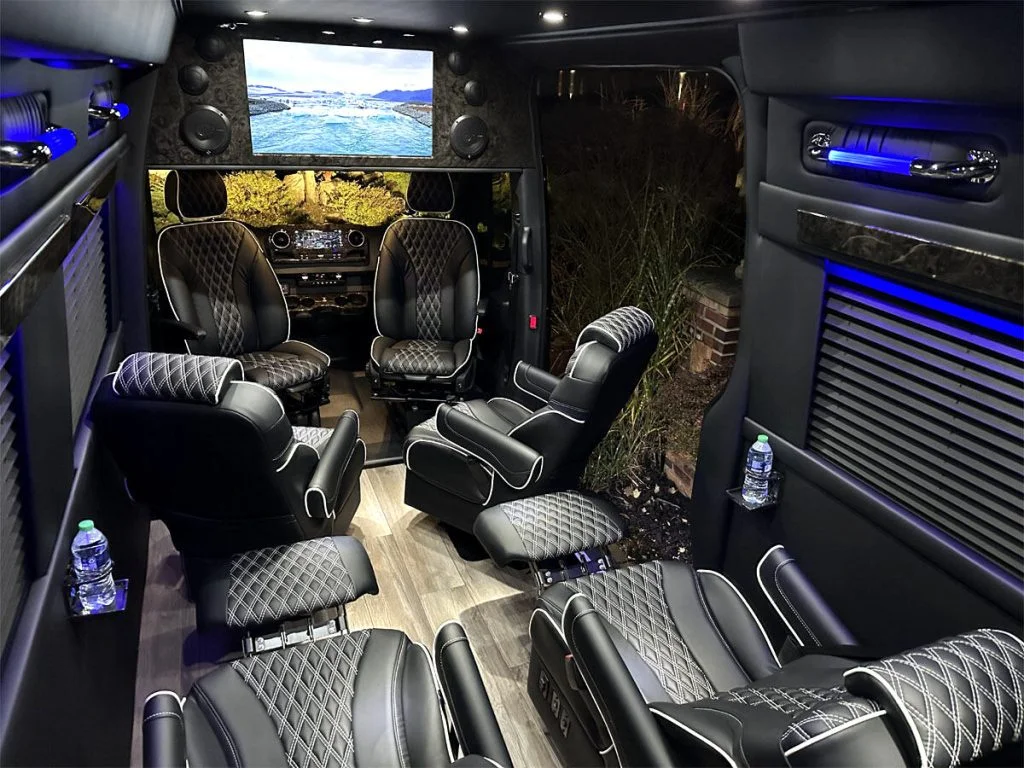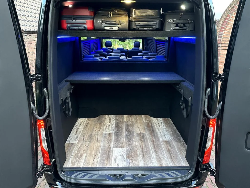 Auto Elite’s Minibus is designed for executive transportation over long distances. This 15 passenger shuttle features large legroom, reclinable diamond stitch shuttle seats, fold down cupholders, USB charge ports, fold out laptop tables, and a three story trunk with golf straps and overhead storage accessible from the interior of the custom sprinter van.