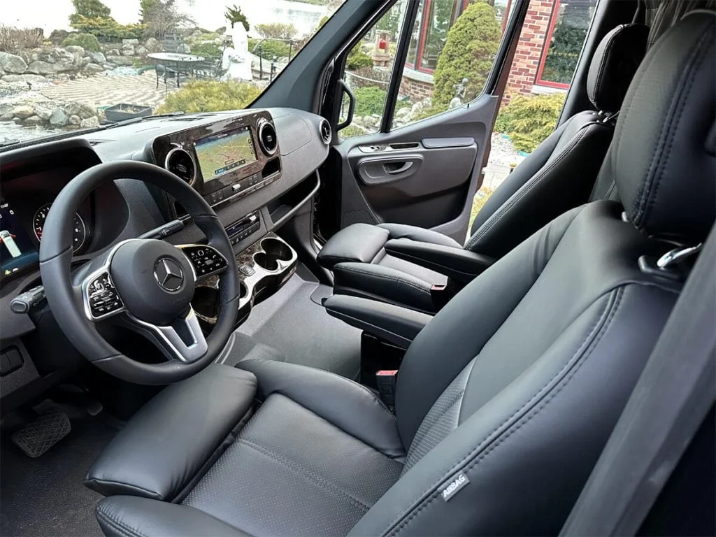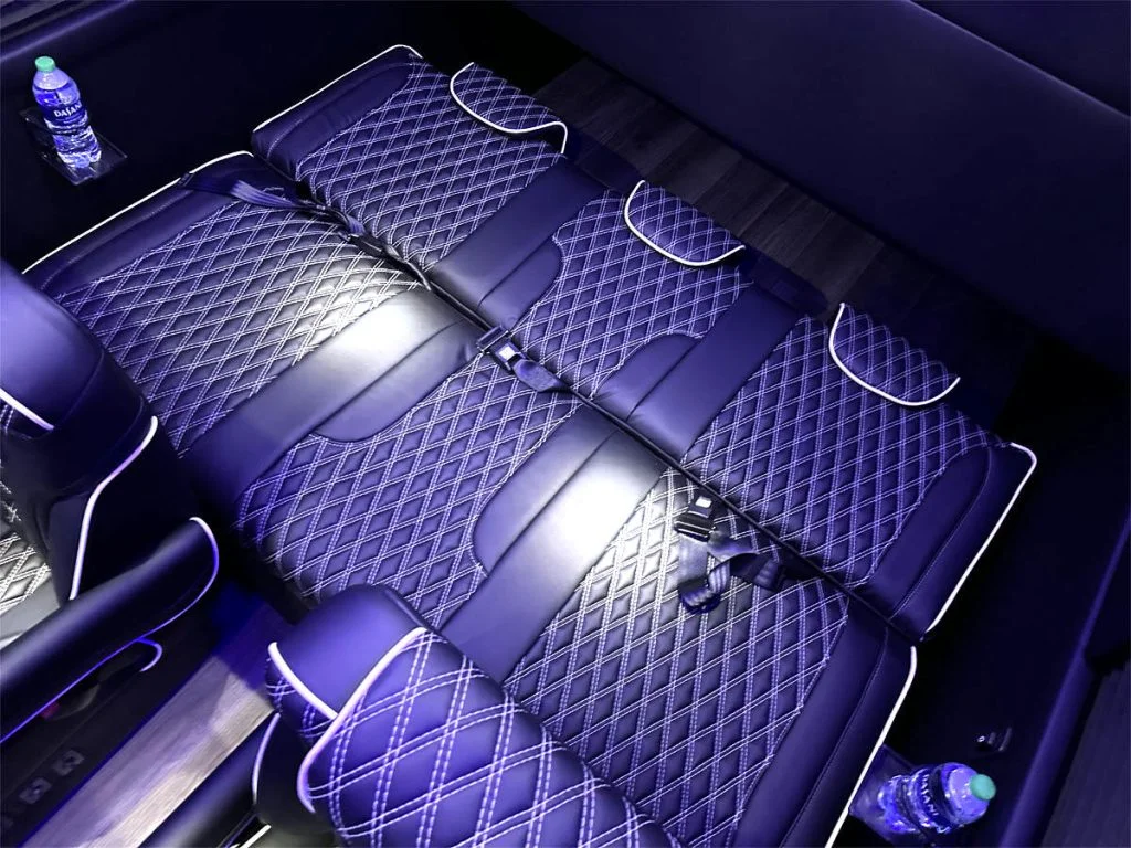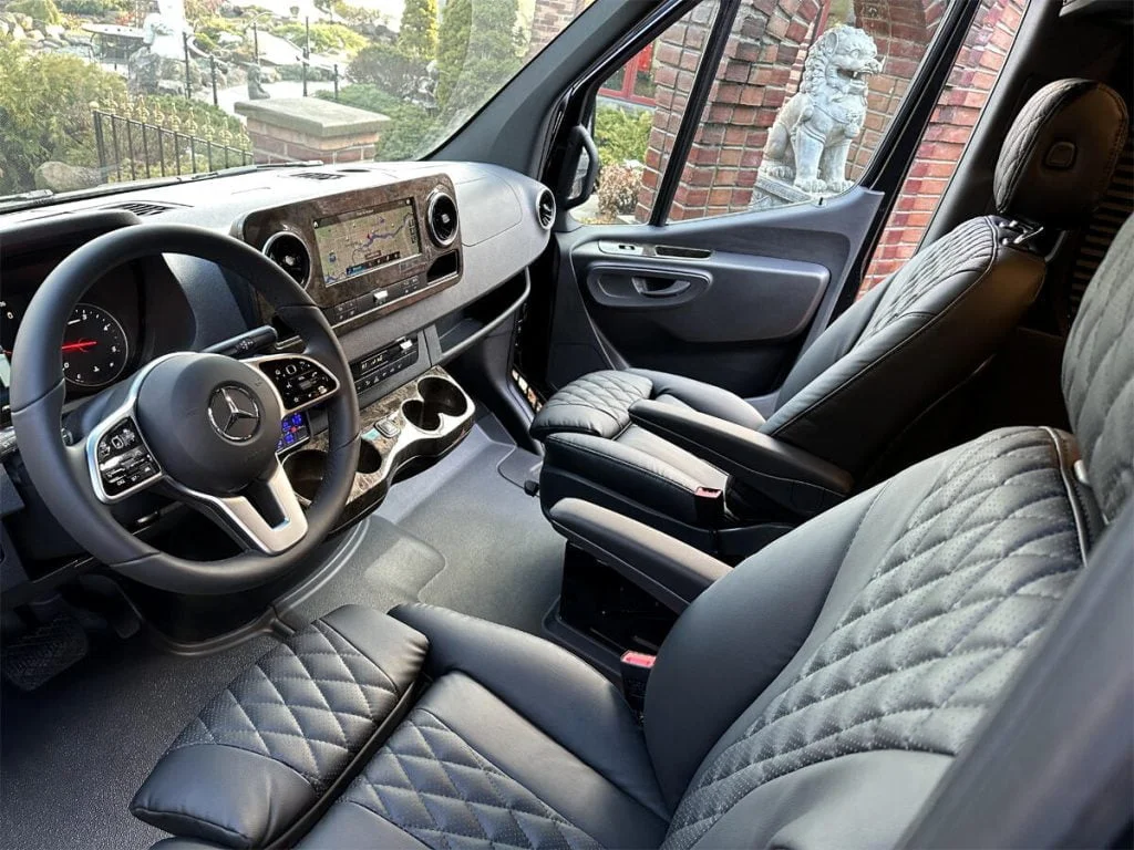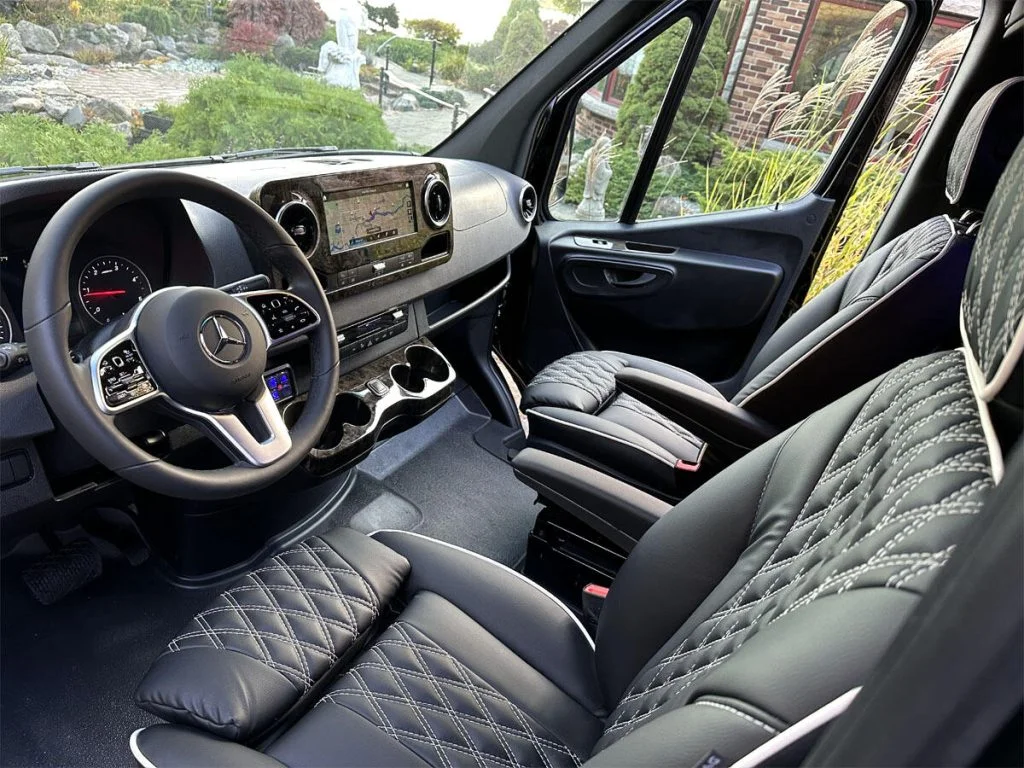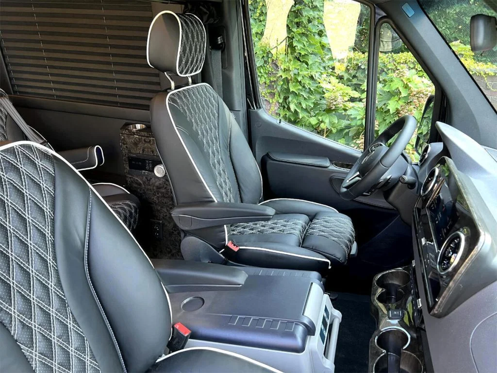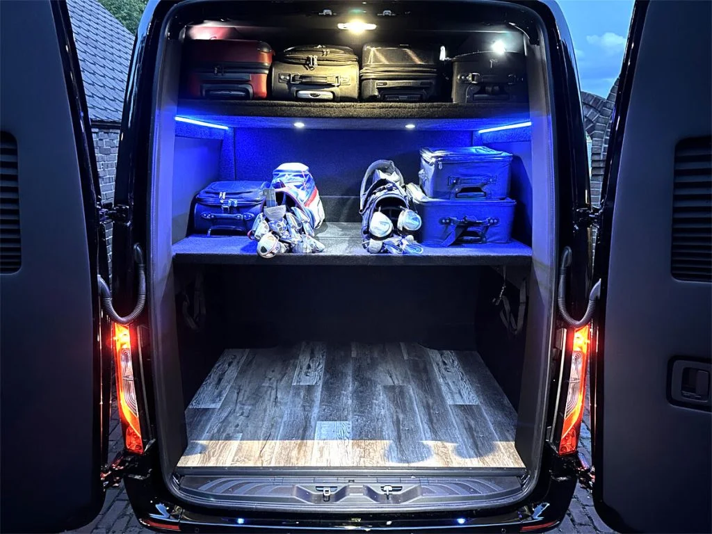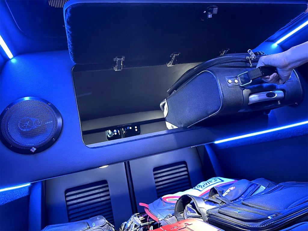 Auto Elite’s Minibus is designed for executive transportation over long distances. This 15 passenger shuttle features large legroom, reclinable diamond stitch shuttle seats, fold down cupholders, USB charge ports, fold out laptop tables, and a three story trunk with golf straps and overhead storage accessible from the interior of the custom sprinter van.
