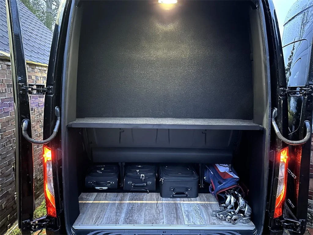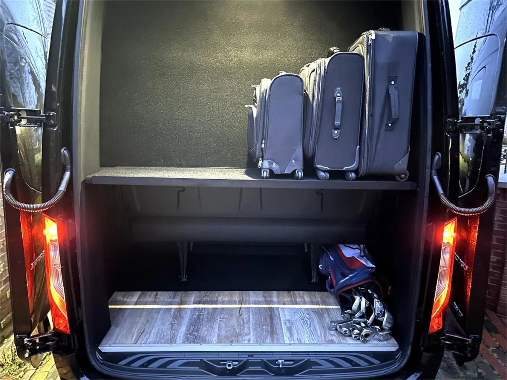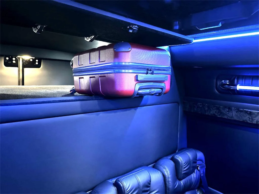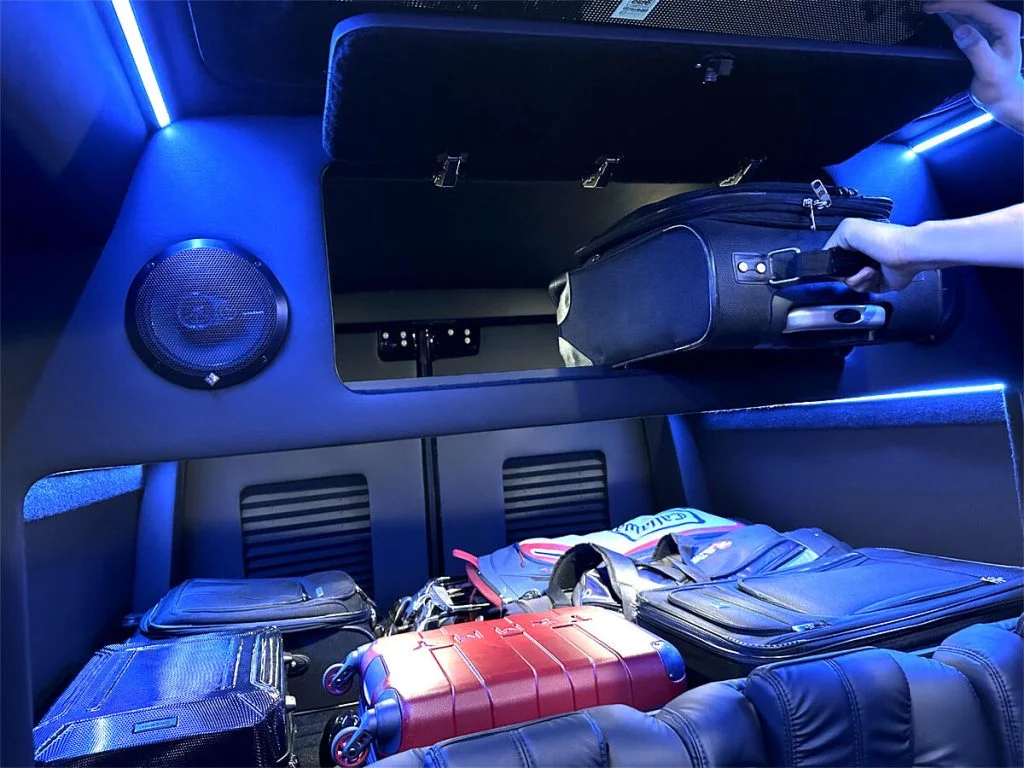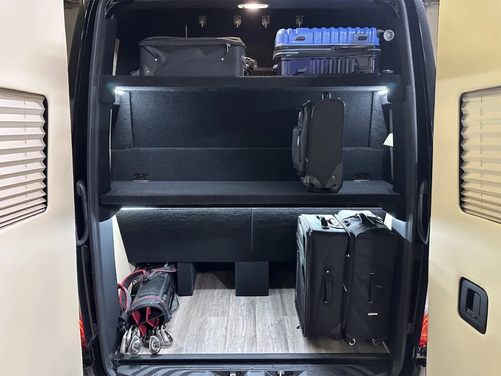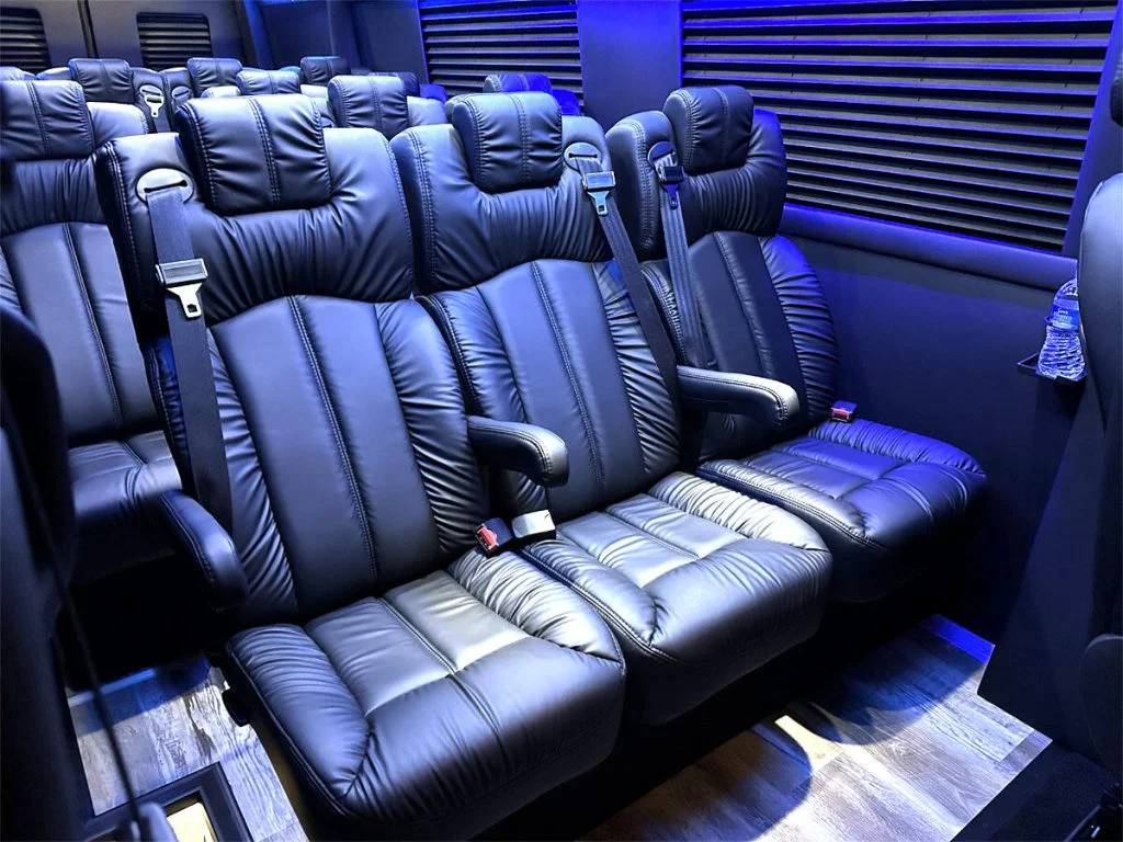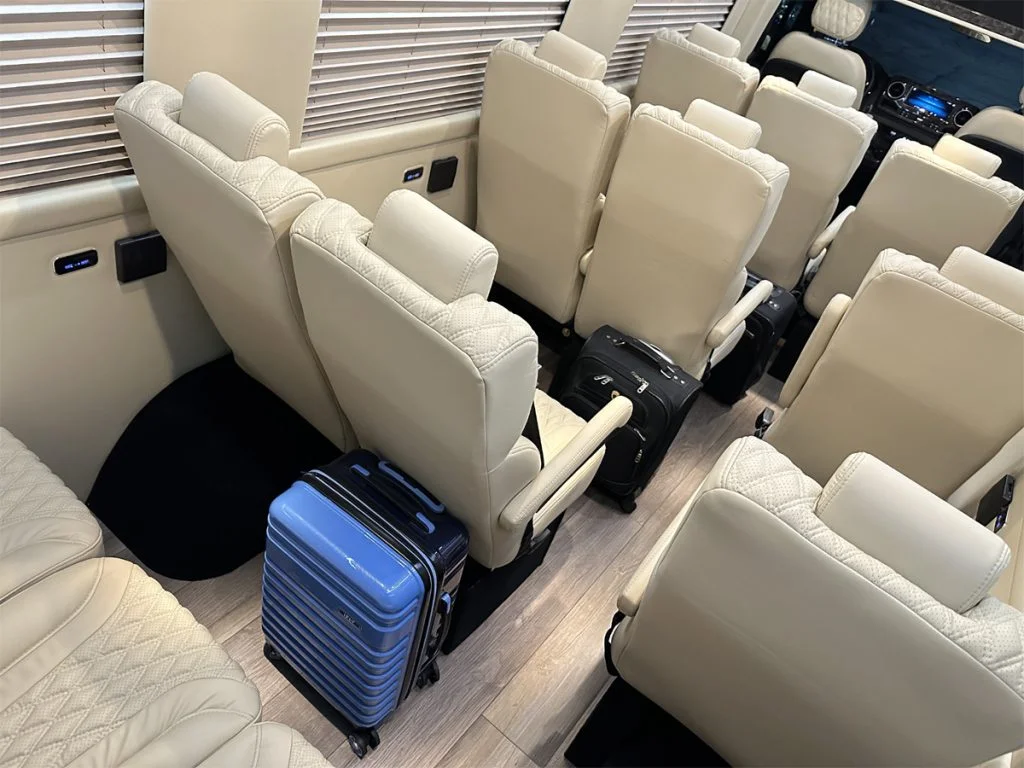 Auto Elite’s Road Liner 747 is designed for livery and large luggage transportation over short trips. This 15 passenger shuttle features average legroom, reclinable plush shuttle seats, fold down cupholders, USB charge ports, and a double sized three story trunk with golf straps and overhead storage accessible from the interior of the custom sprinter van. This vehicle is ideal for airport and resort/hotel livery.