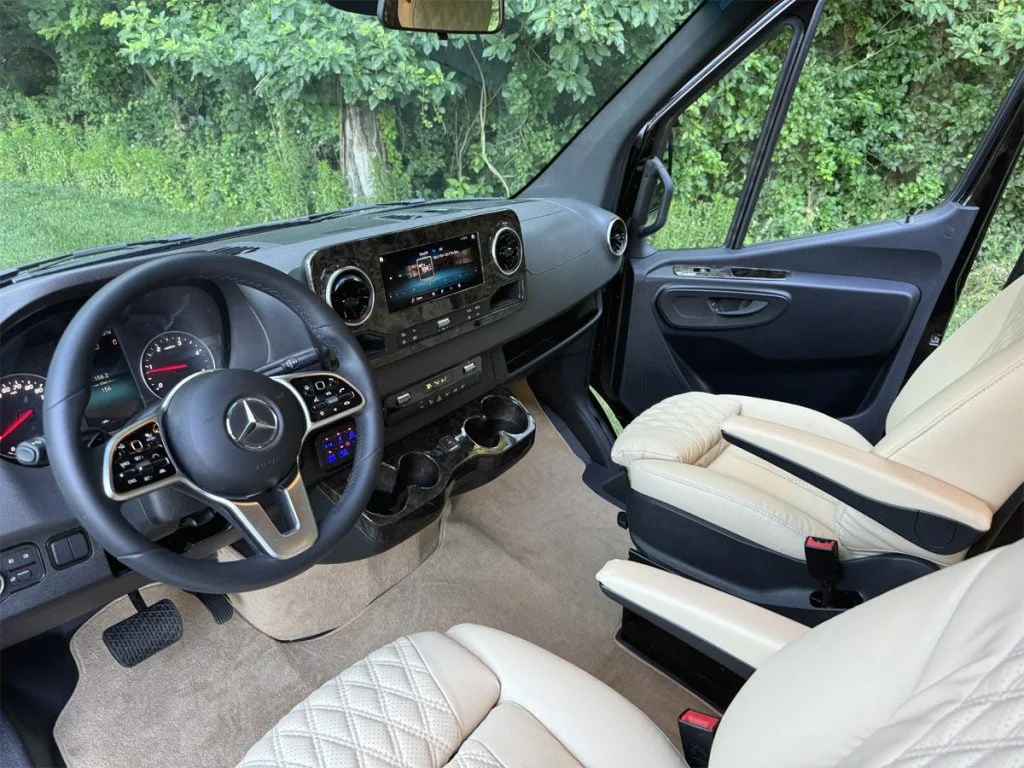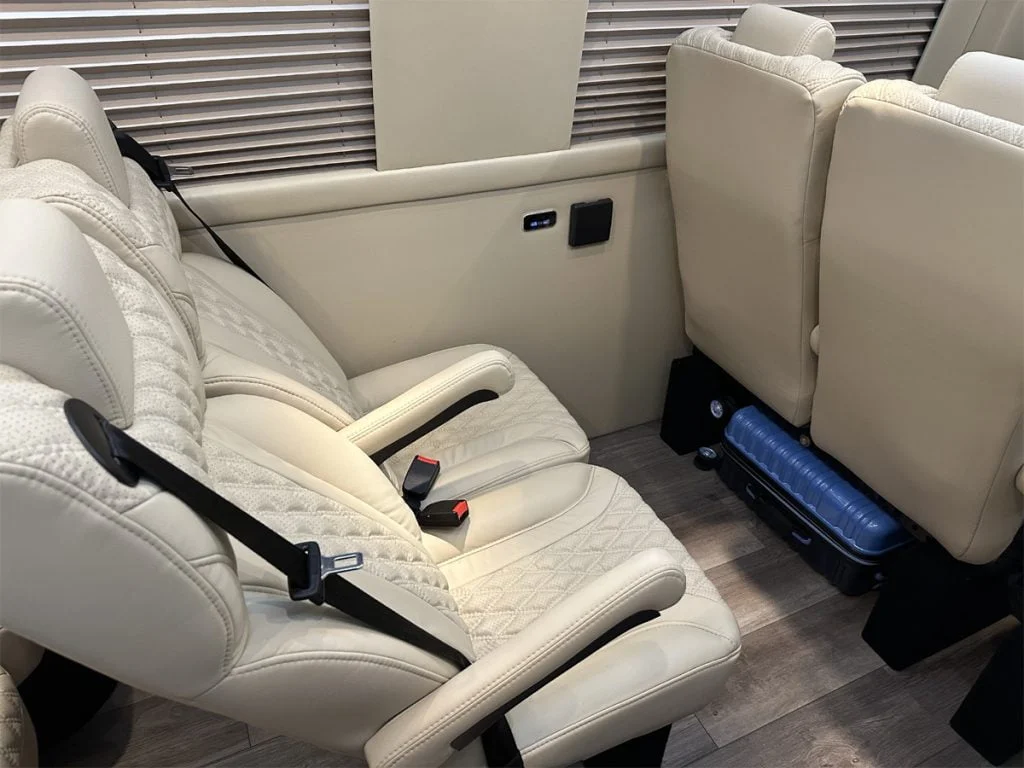 Auto Elite’s Road Liner 737 is designed for luxury executive transportation in captain chairs over long trips. This 9 passenger luxury van features four captain chairs and a three passenger power fold down sofa with diamond stitching. The vehicle includes fold down cupholders, USB charge ports, fold out laptop tables, and a double sized three story trunk with golf straps and overhead storage accessible from the interior. This is one of Auto Elite’s intro luxury coaches.