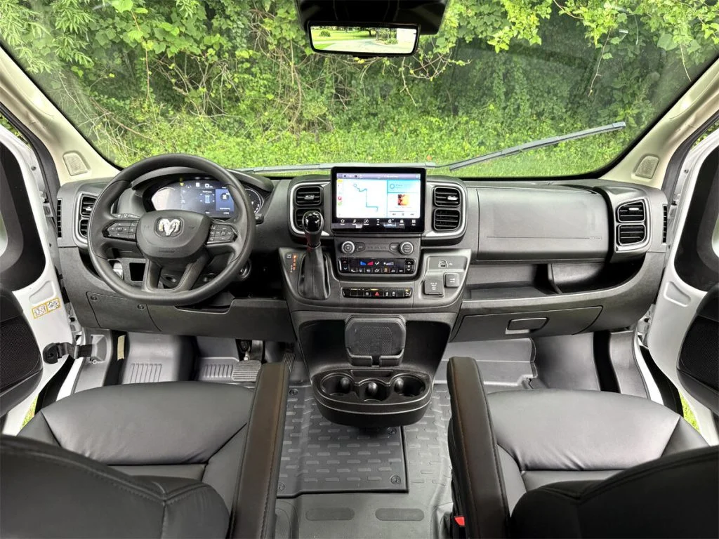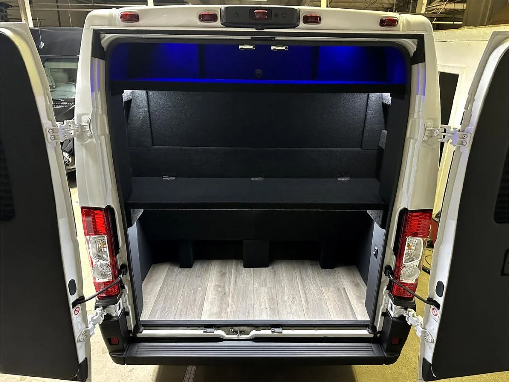 Auto Elite’s ProMaster Shuttle is designed for affordable livery and luggage transport over short distances. This 15 passenger shuttle features reclinable plush shuttle seats, fold down cupholders, USB charge ports, and a three story trunk with golf straps and overhead storage accessible from the interior. This conversion is built on a Ram ProMaster to reduce cost.
