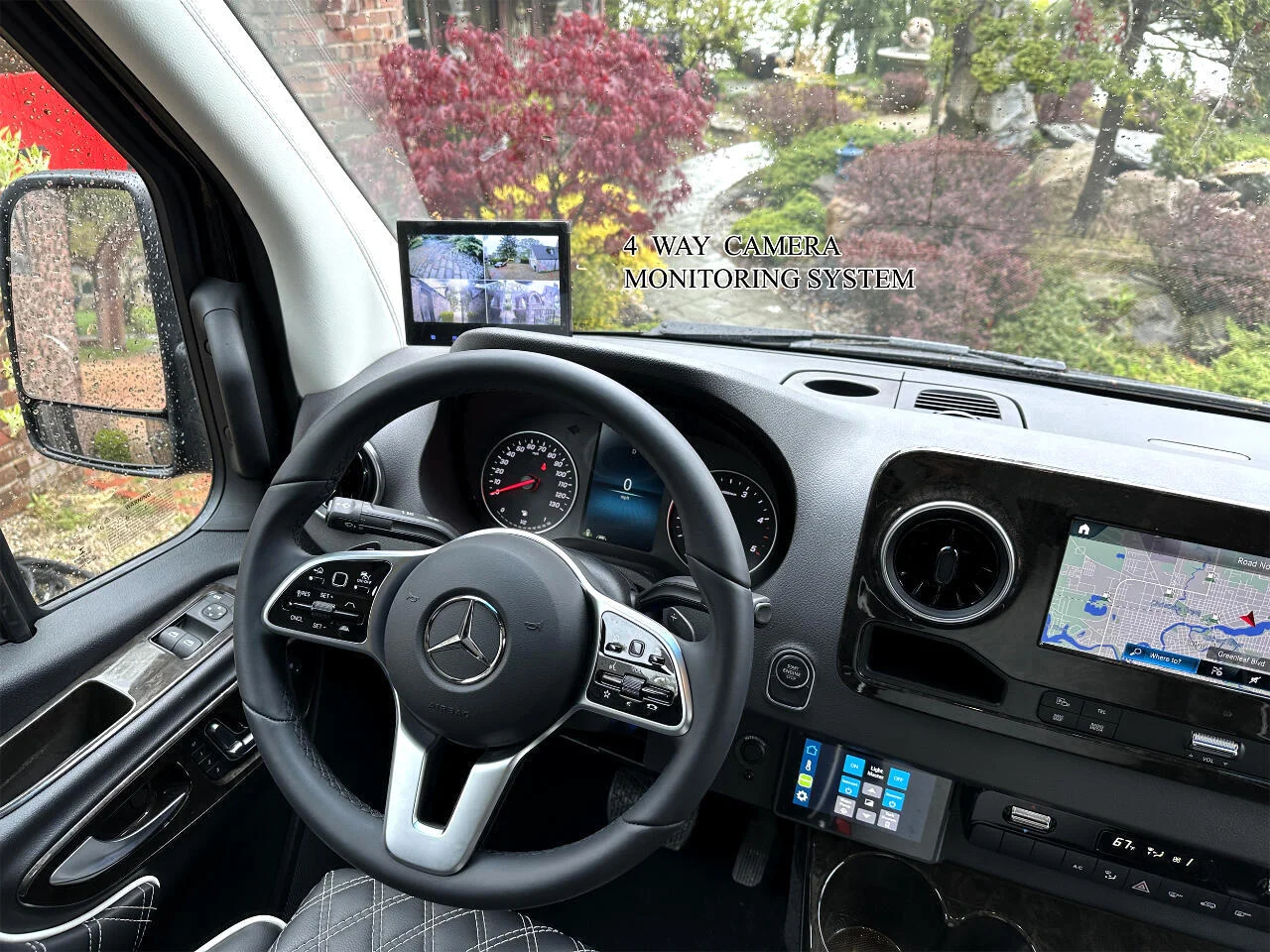 View the front, rear, left, and right side of your custom van at any time using our 4 Way Camera System and Dash Monitor. DVR can be installed to automatically record video upon request.