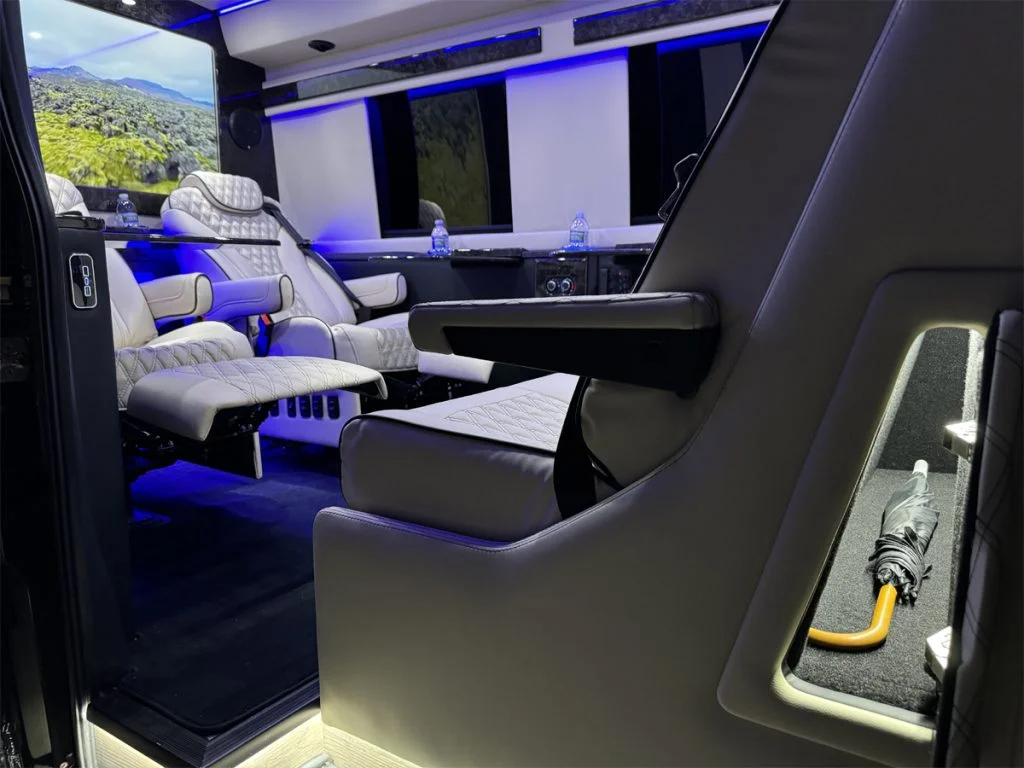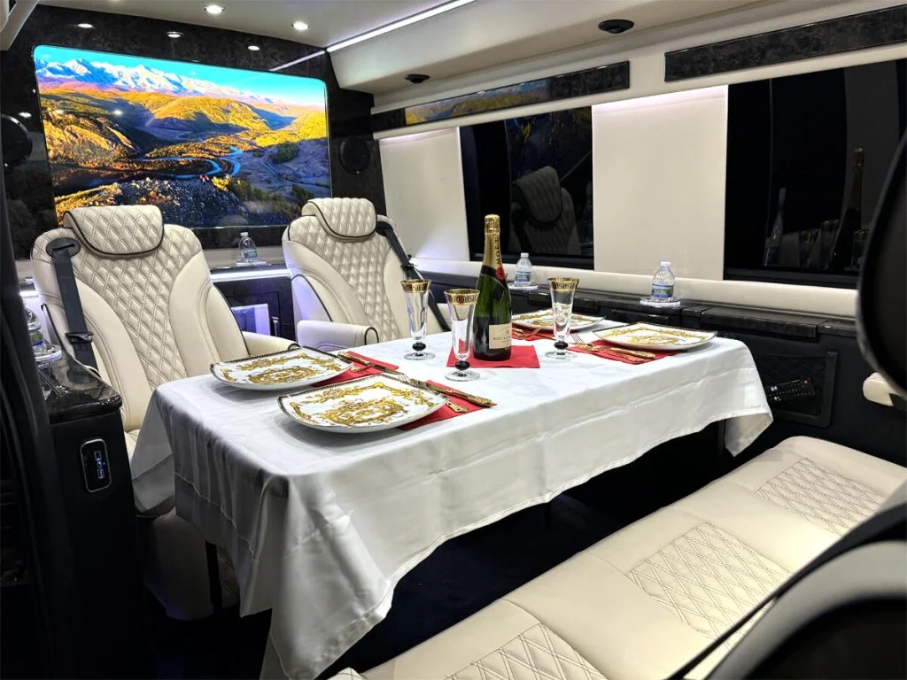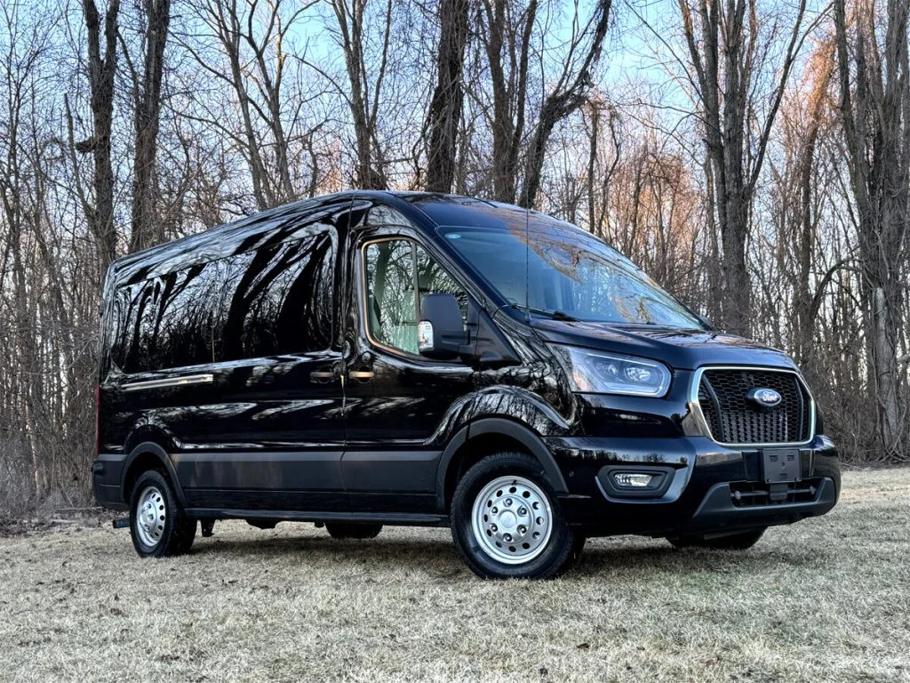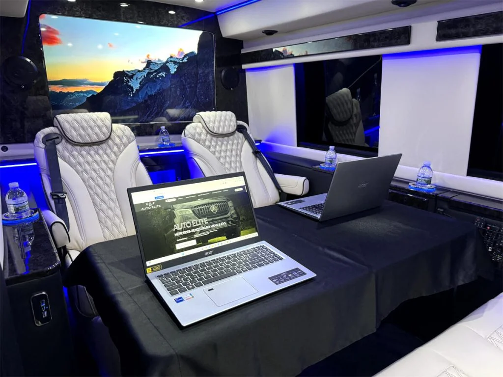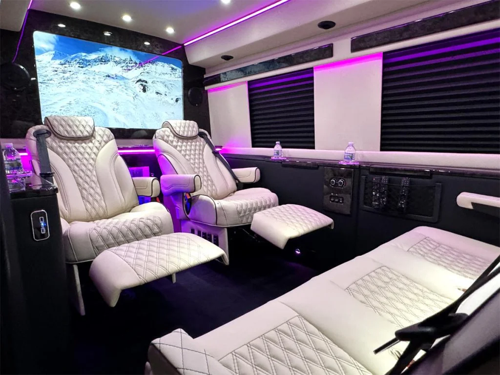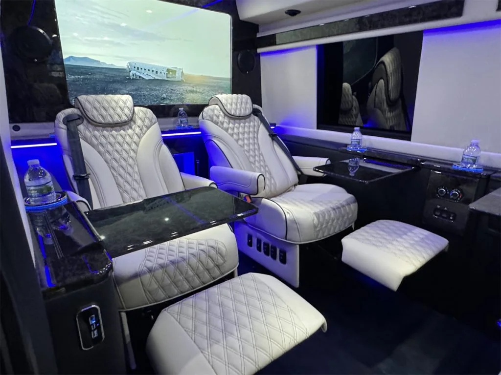 Auto Elite manufactures custom floorplans and limousines on Ford Transit Chassis at client request. When designing a Custom Ford Transit Conversion Van, it is important to note the chassis is not as long as the Mercedes-Benz Sprinter Chassis. As a result, there is less space for seating or equipment within the vehicle. Trunk space is also limited.