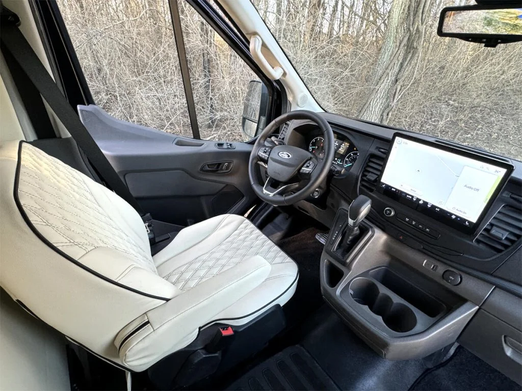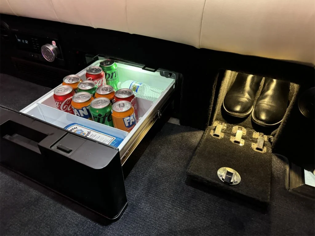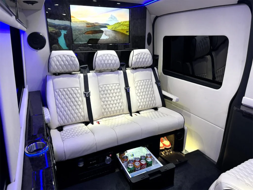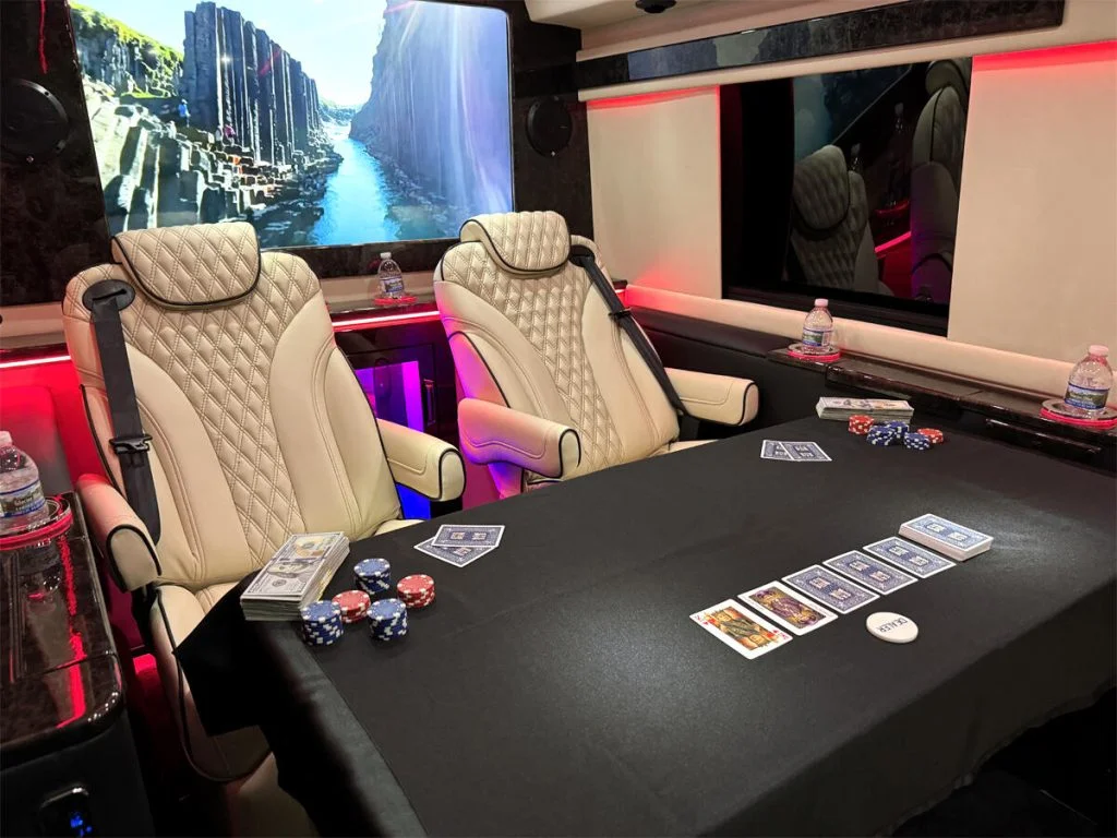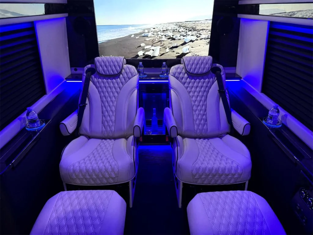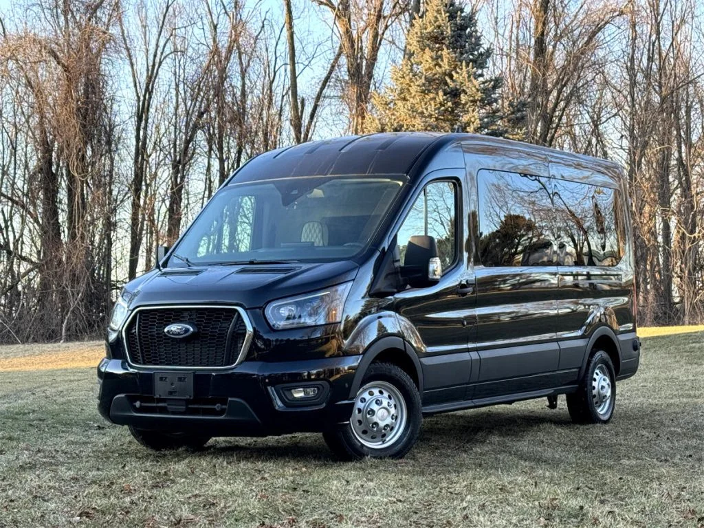Auto Elite manufactures custom floorplans and limousines on Ford Transit Chassis at client request. When designing a Custom Ford Transit Conversion Van, it is important to note the chassis is not as long as the Mercedes-Benz Sprinter Chassis. As a result, there is less space for seating or equipment within the vehicle. Trunk space is also limited.