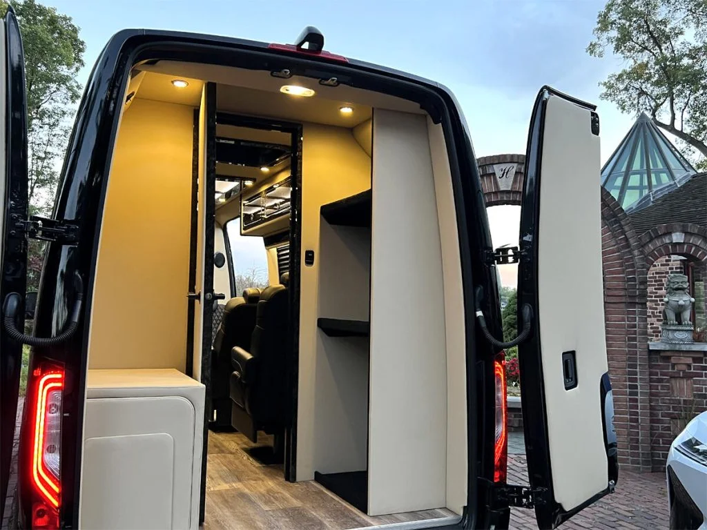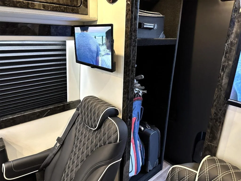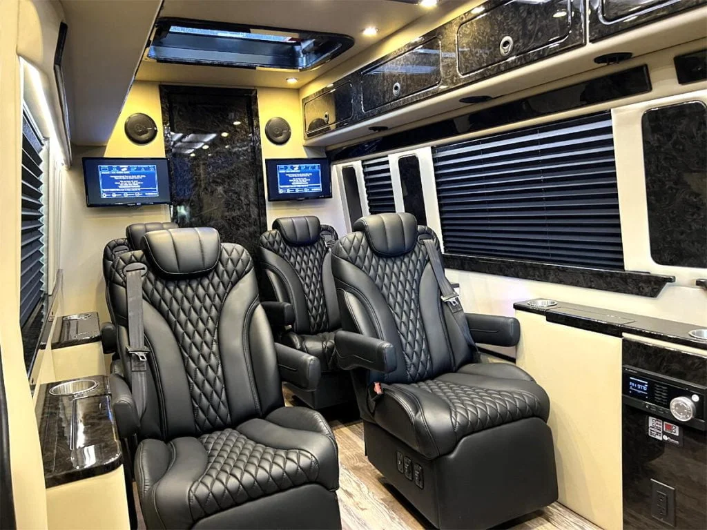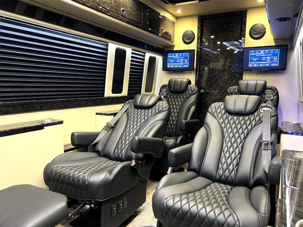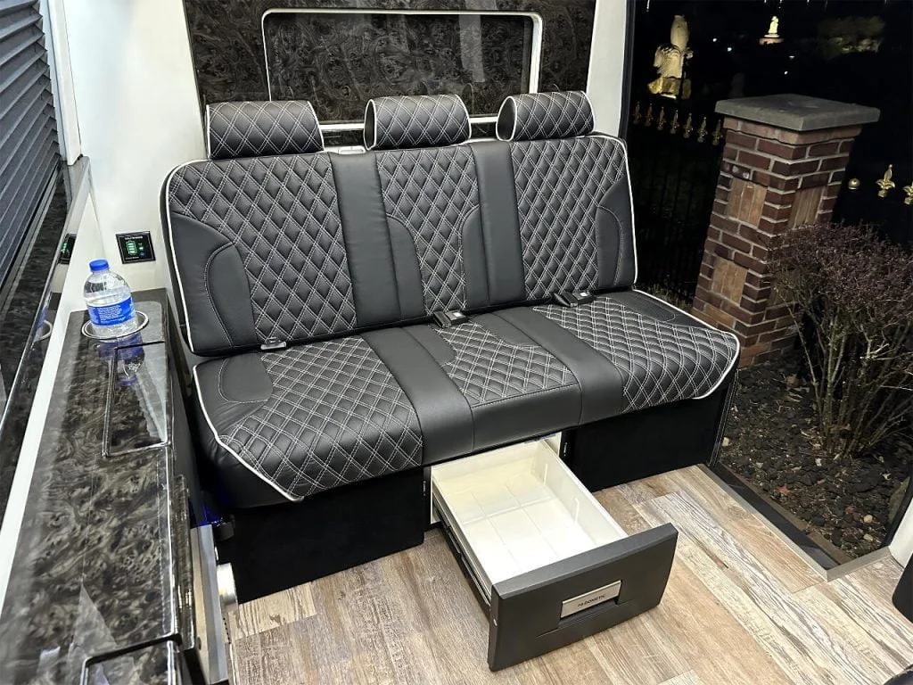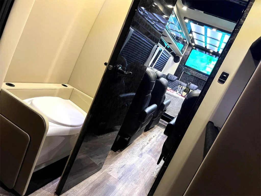With the Road Jet, you can commute between regional offices, entertain important customers, work on the go, or travel with loved ones in absolute luxury. Each captain chair comes with a fold out console table to enable work on the go. The limousine partition wall at the front and shades provide total privacy to the cabin. The vehicle contains overhead cabinets and a closet in the backroom for storage. The backroom also contains a removable bathroom that can be used in transit during all four seasons. The bathroom’s cassette toilet can be filled with antifreeze and serviced at any gas station or at home. Contact Auto Elite today to discuss our floorplans, review accessory options, and secure your Road Jet.