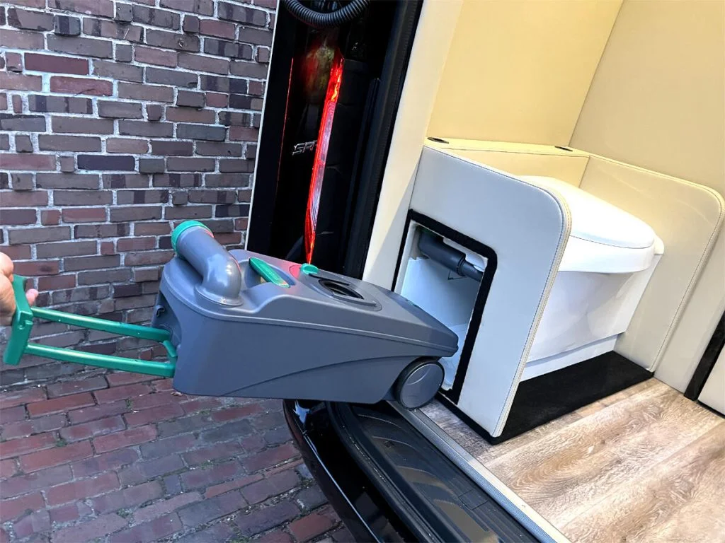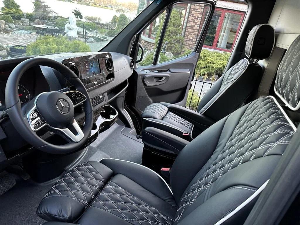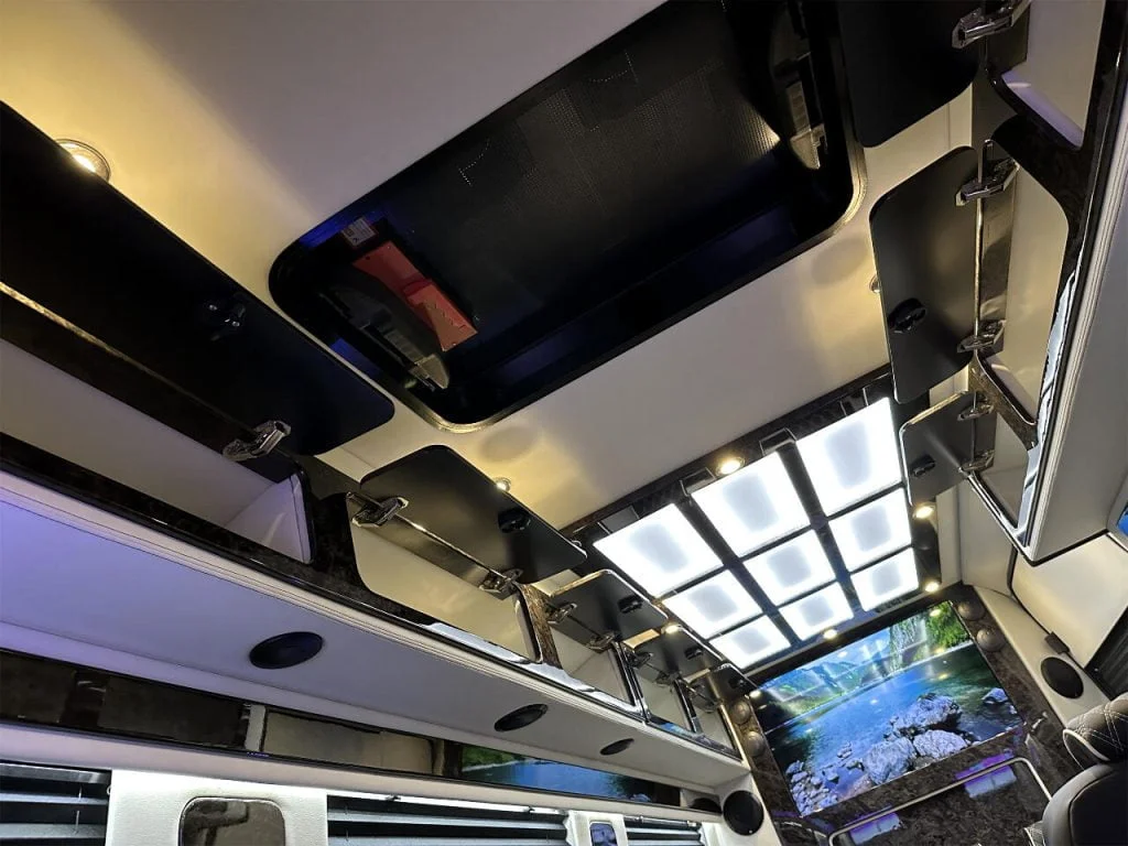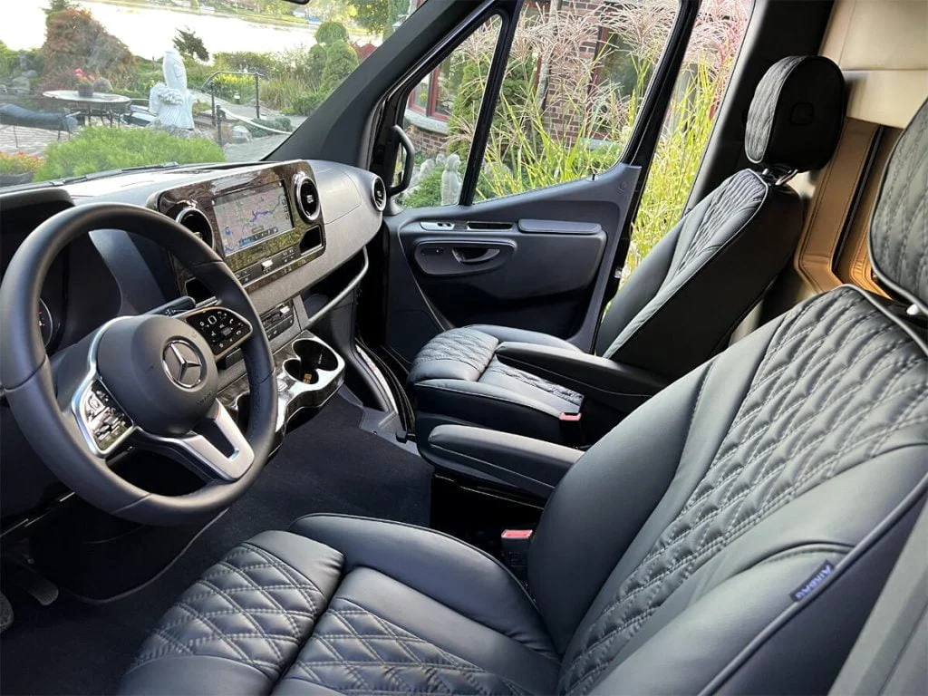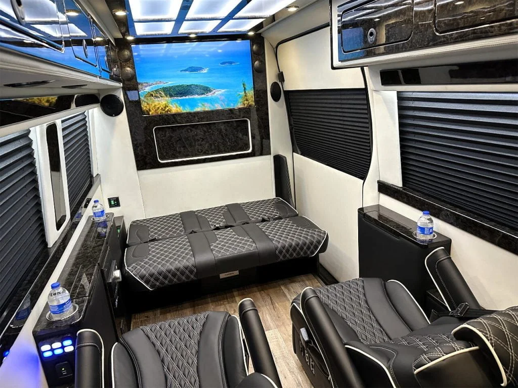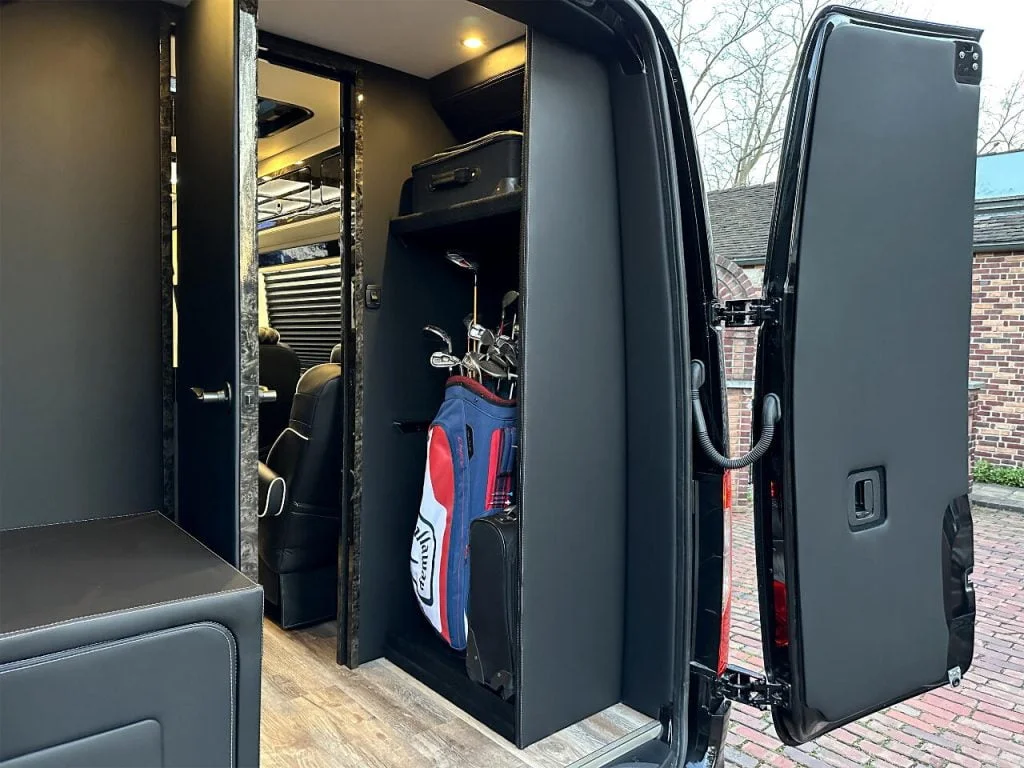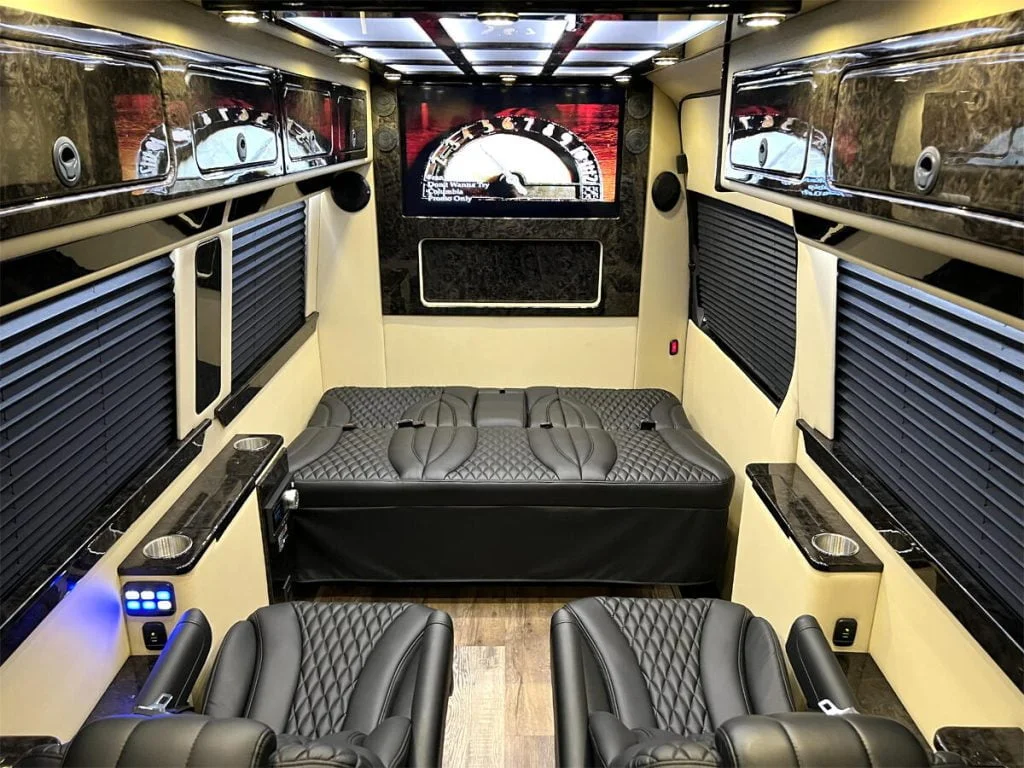 With the Road Jet, you can commute between regional offices, entertain important customers, work on the go, or travel with loved ones in absolute luxury. Each captain chair comes with a fold out console table to enable work on the go. The limousine partition wall at the front and shades provide total privacy to the cabin. The vehicle contains overhead cabinets and a closet in the backroom for storage. The backroom also contains a removable bathroom that can be used in transit during all four seasons. The bathroom’s cassette toilet can be filled with antifreeze and serviced at any gas station or at home. Contact Auto Elite today to discuss our floorplans, review accessory options, and secure your Road Jet.