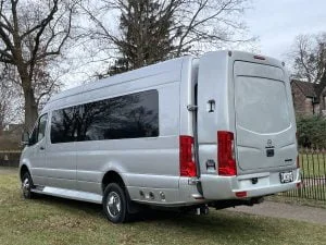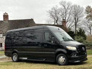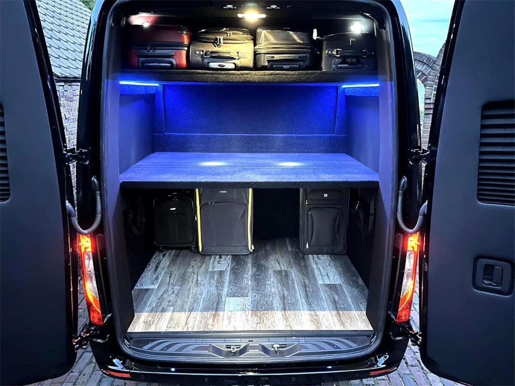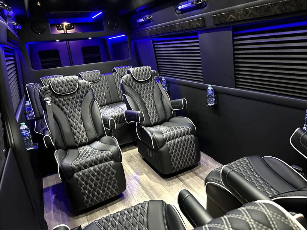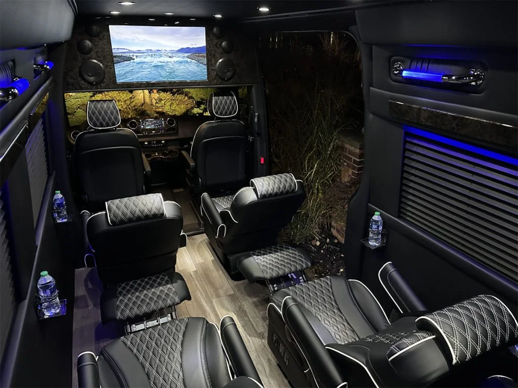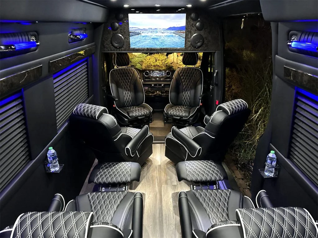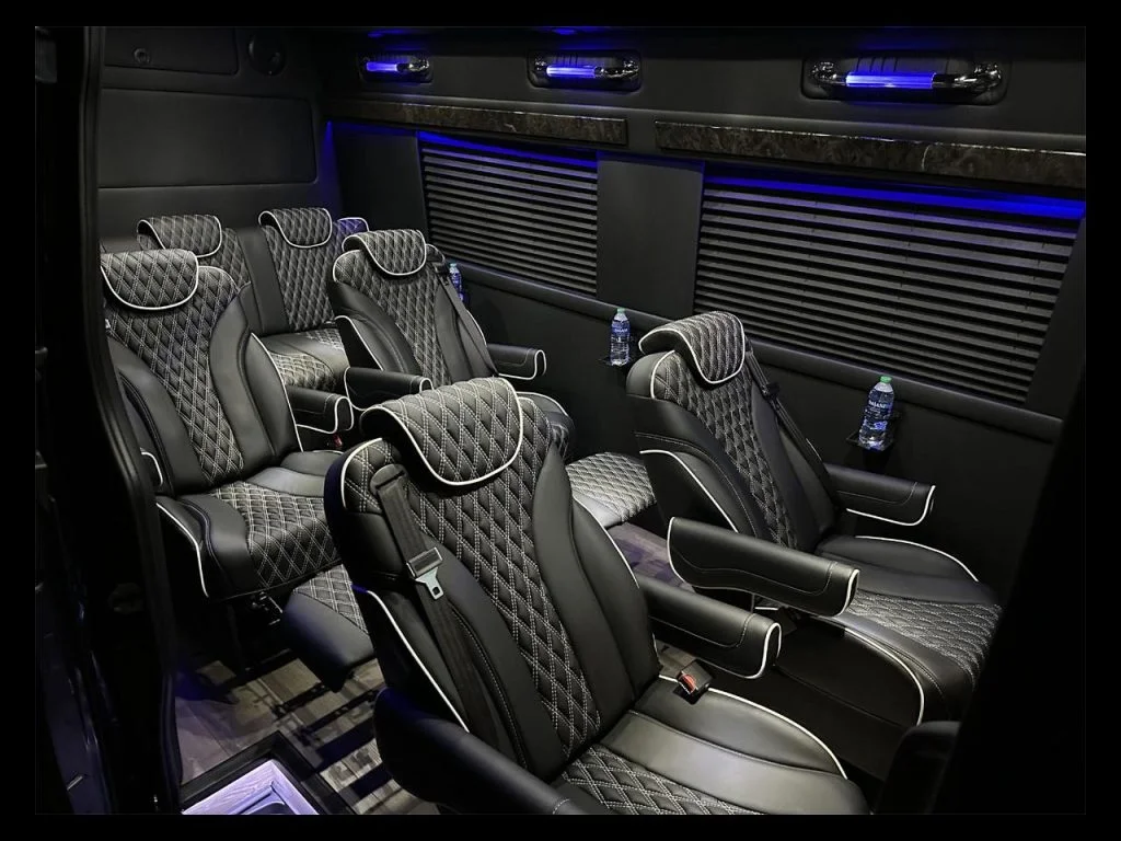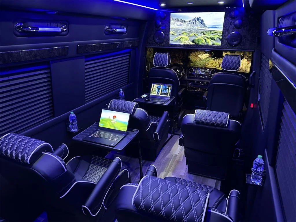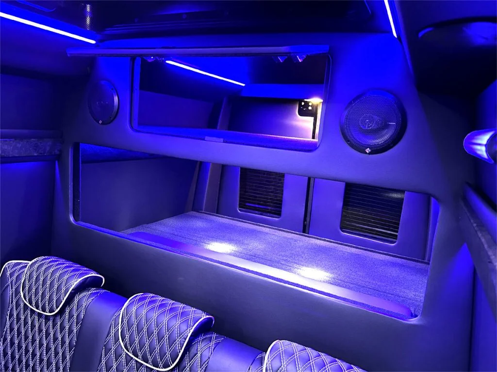 The Road Liner 737 is designed for luxury transport of 9-10 passengers and large amounts of travel luggage. The model is perfect for airport livery, hotels, resorts, and other hospitality transportation. Clients can choose between a fold-down three person sofa or stationary four person bench in the back. Cupholders and USB/USB-C chargers can be installed on the walls or on side consoles along the length of the vehicle.