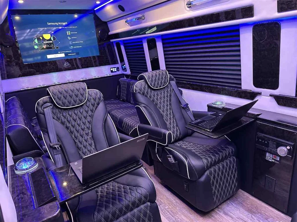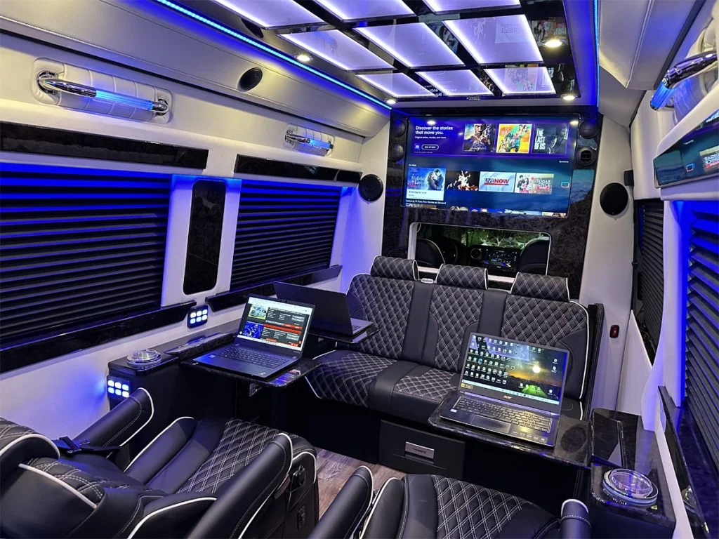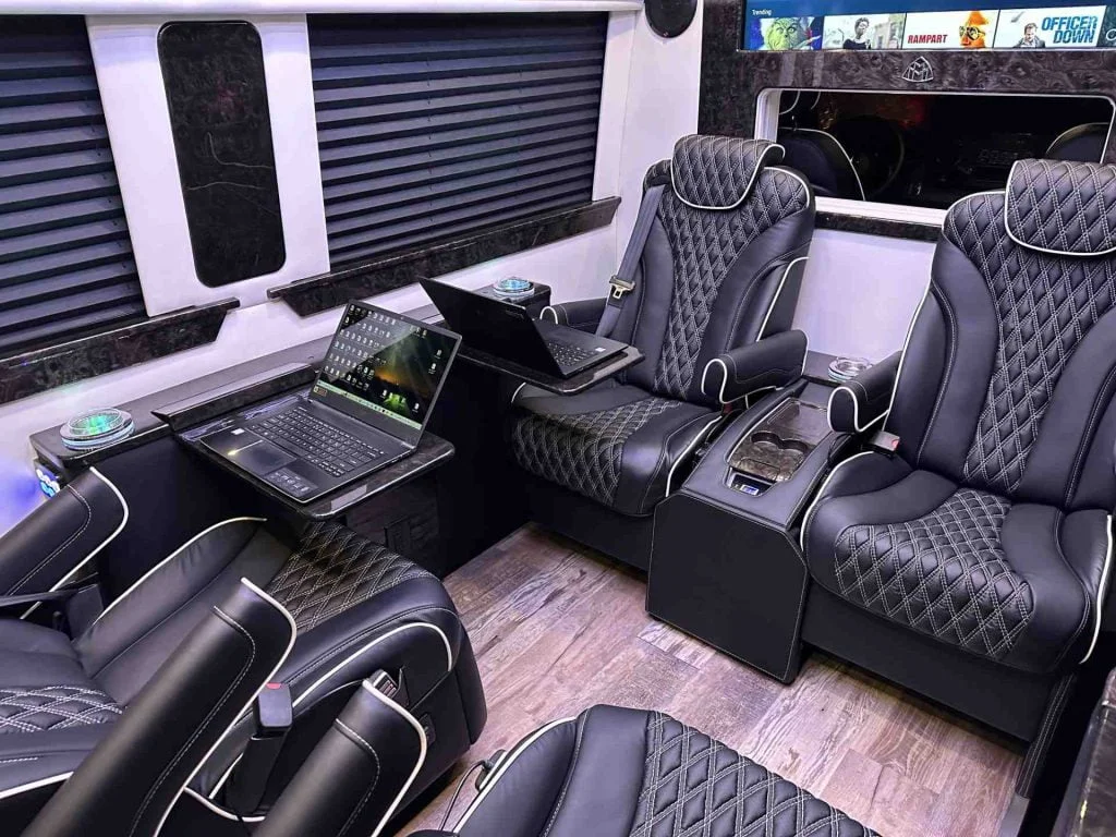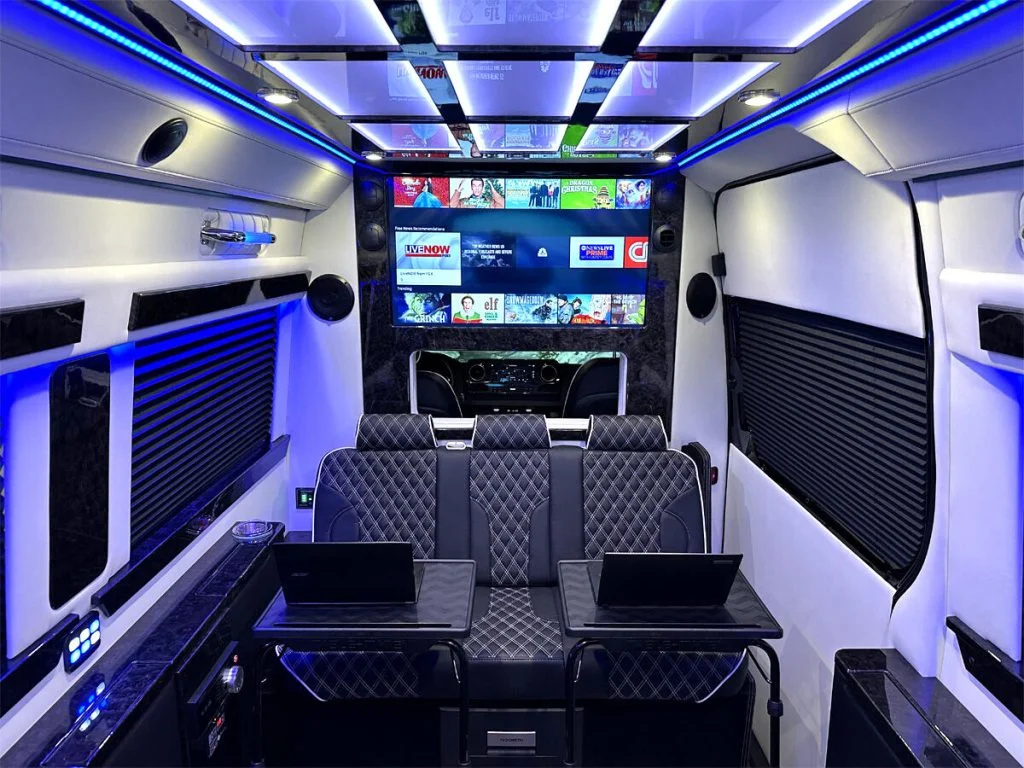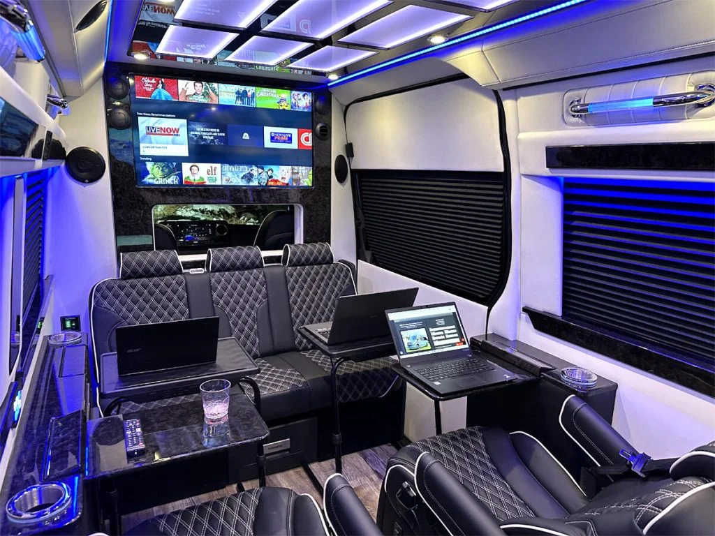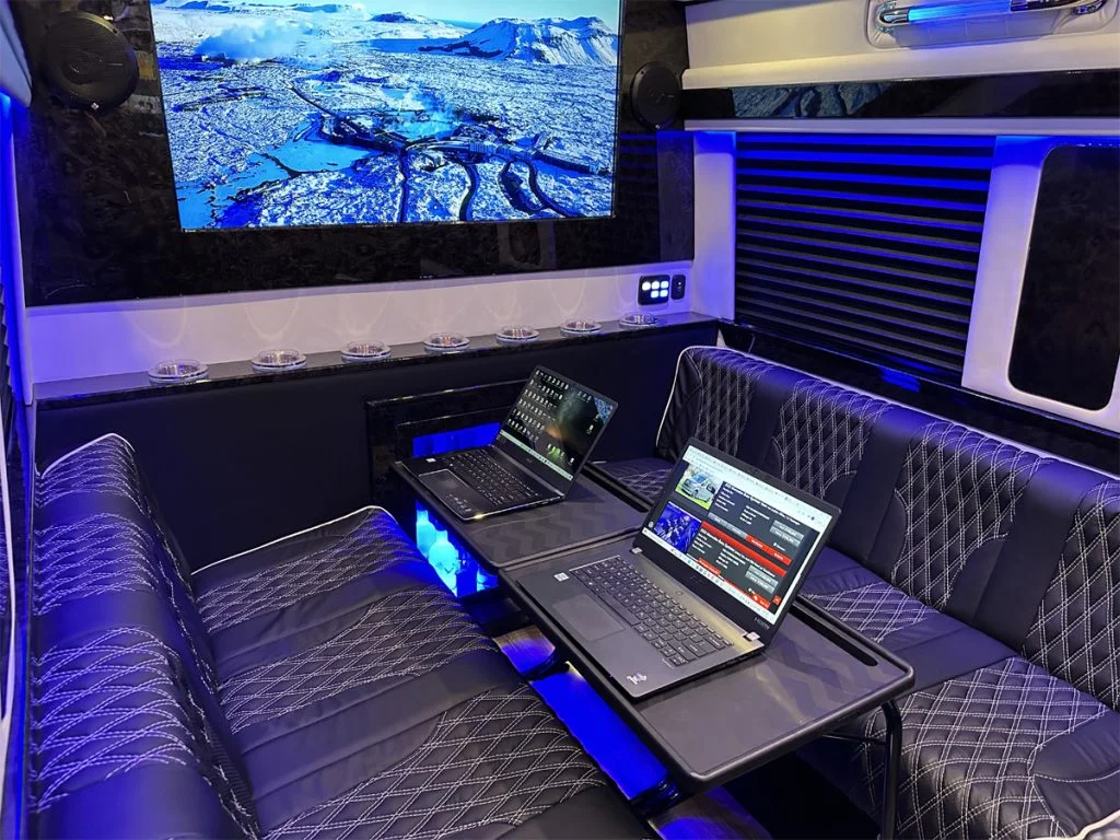 The Road Liner Limousine is unique because its amenities enable both high performance work and ultra luxury entertainment.