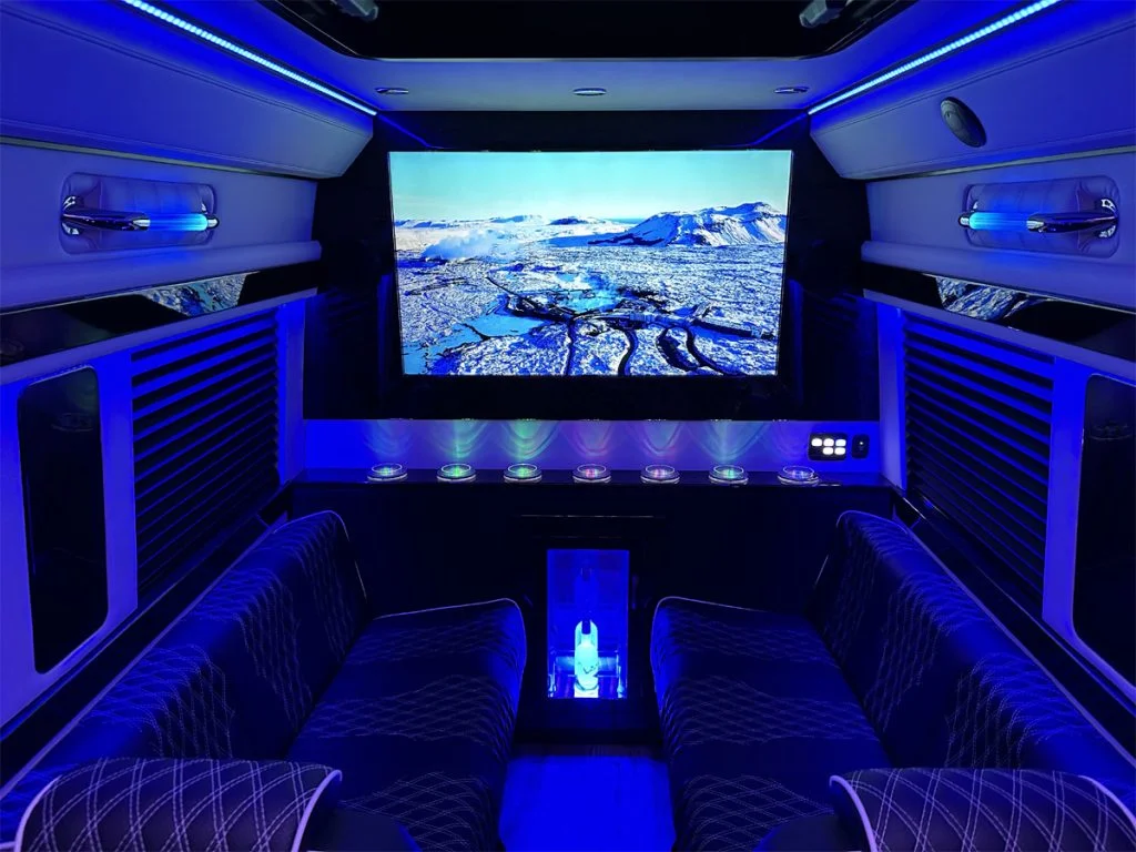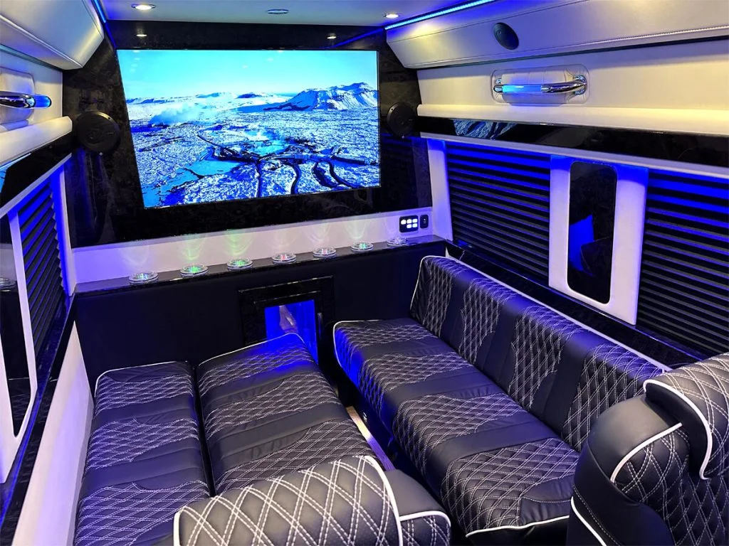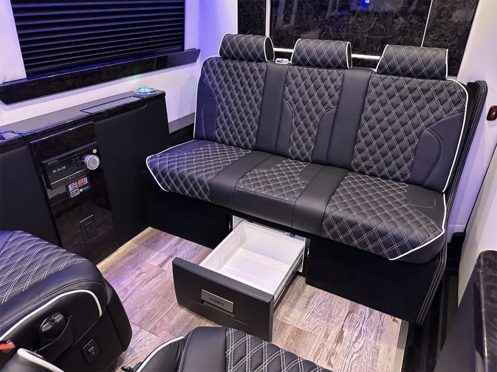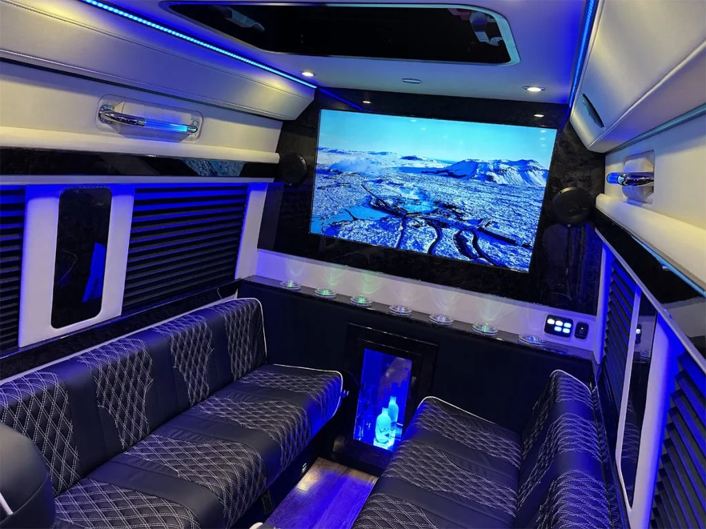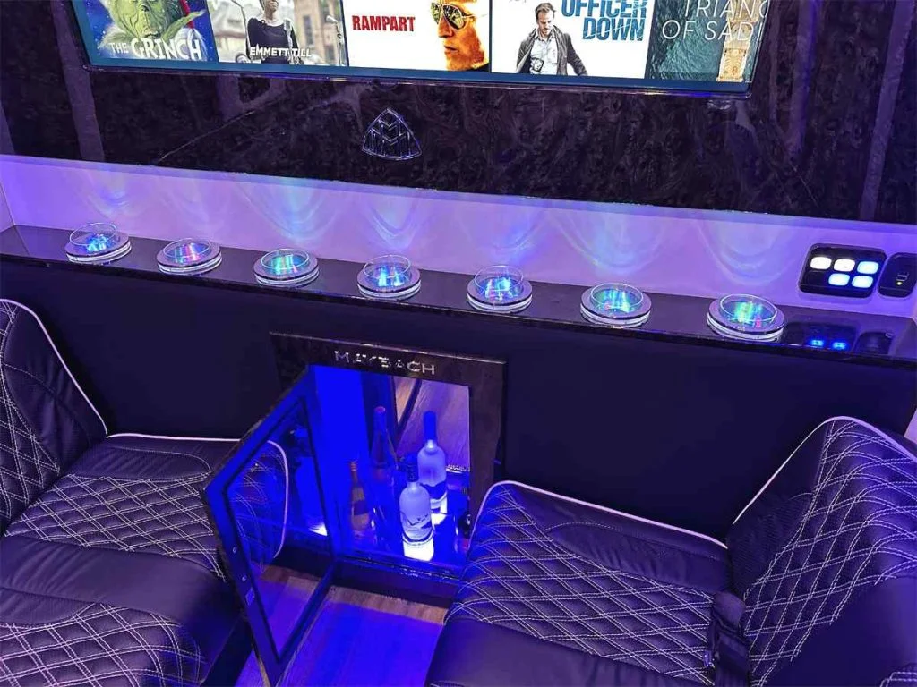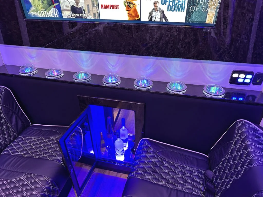 Each vehicle has three fold out console tables, a limousine partition wall, and privacy shades to create a high performance silent work environment. A long table can be added in between the four person sofas to create a dining table or workspace. When the cabin is to be used for entertainment, the full bar on the back partition wall, two flat screen TV’s, and a refrigerator underneath the reverse sofa bed make entertaining customers, partying with friends, or tailgating with family easy. Contact Auto Elite today to discuss our floorplans, review accessory options, and secure your Road Liner Limo.