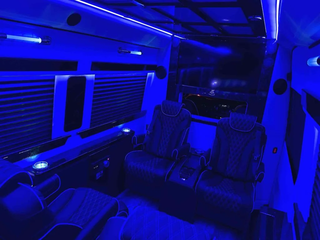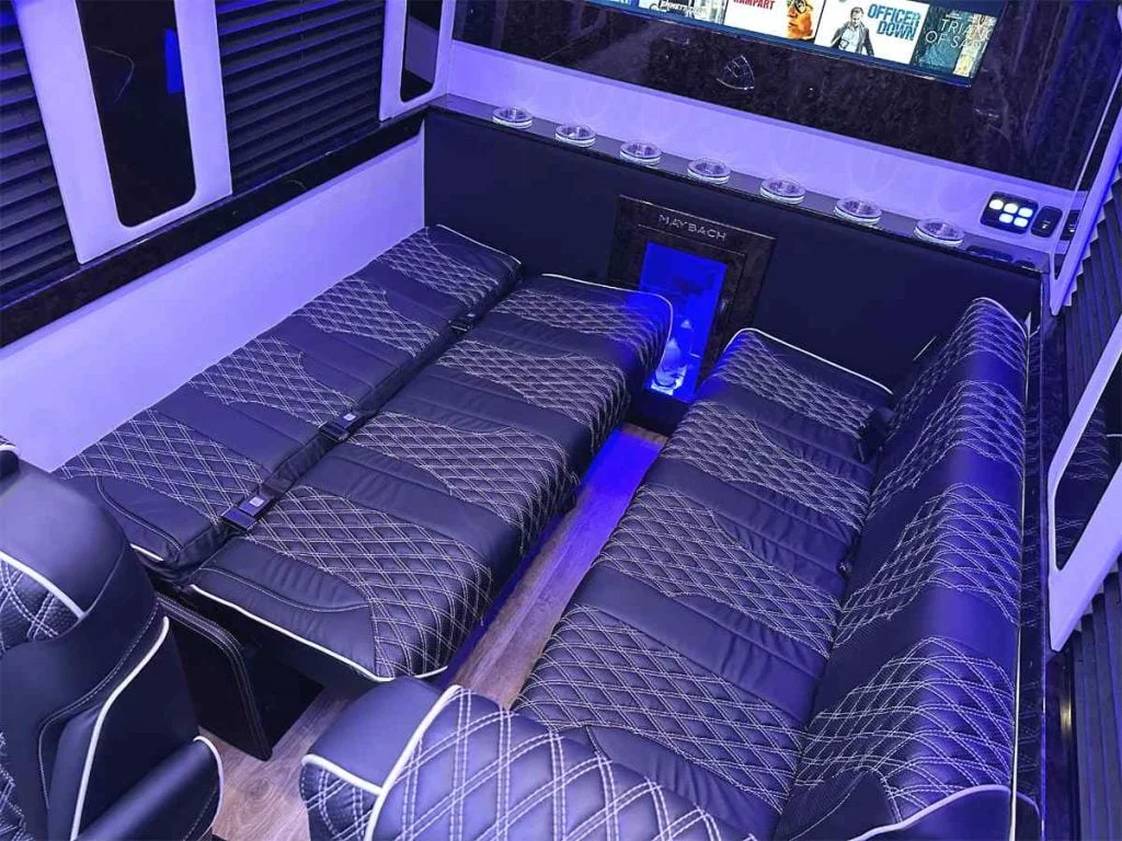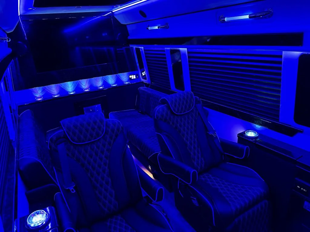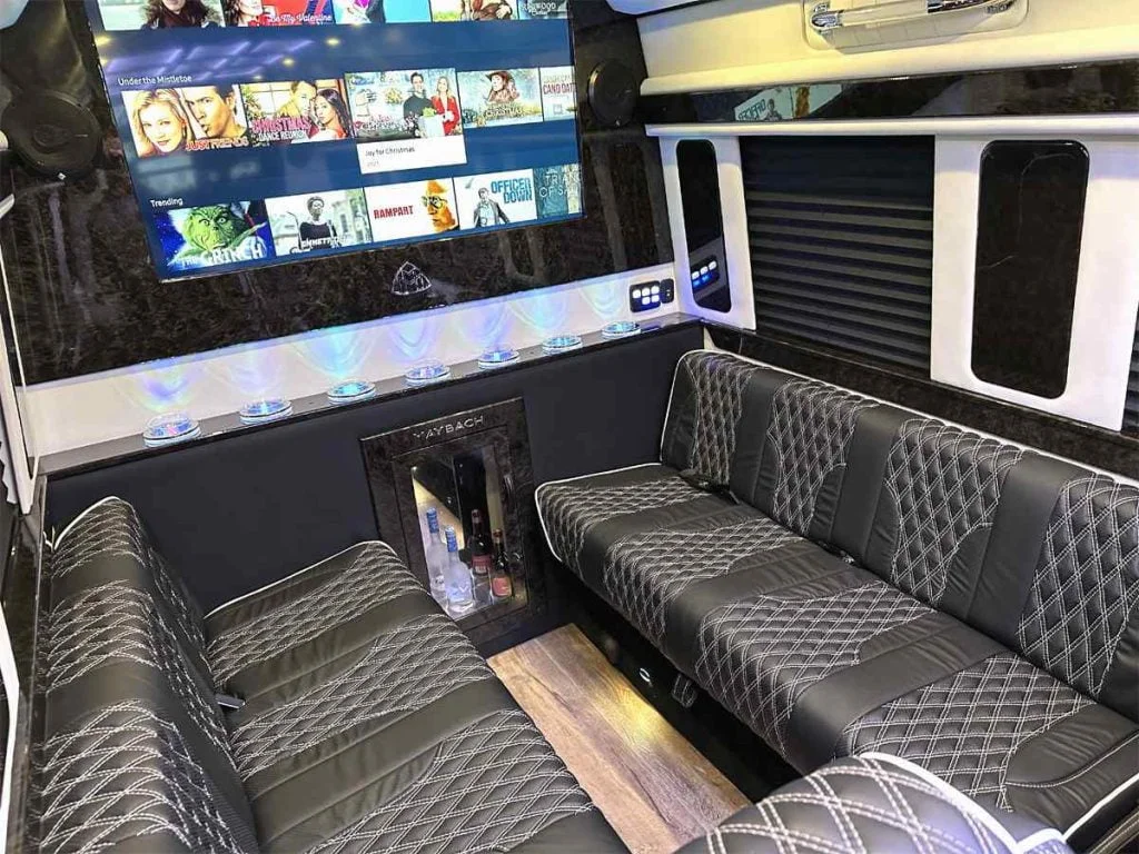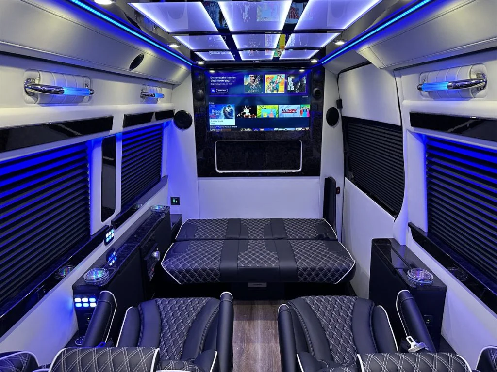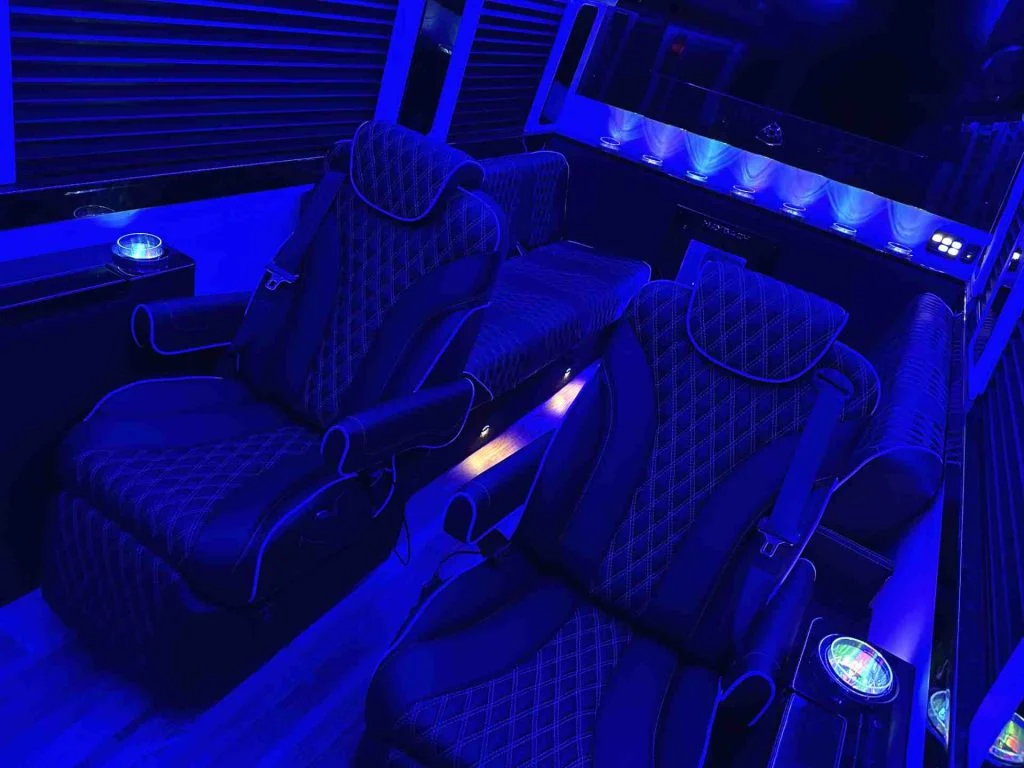 Each vehicle has three fold out console tables, a limousine partition wall, and privacy shades to create a high performance silent work environment. A long table can be added in between the four person sofas to create a dining table or workspace. When the cabin is to be used for entertainment, the full bar on the back partition wall, two flat screen TV’s, and a refrigerator underneath the reverse sofa bed make entertaining customers, partying with friends, or tailgating with family easy. Contact Auto Elite today to discuss our floorplans, review accessory options, and secure your Road Liner Limo.